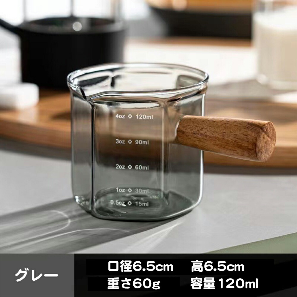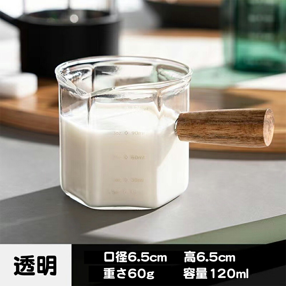 2個セット ミルクピッチャー 120ml ミルクジャグ 小型 計量カップ耐熱ガラス 目盛り付き 斜め注ぎ口 飛散防止 簡単に注ぐ 木製ハンドル コーヒーピッチャー 液体用計量カップ ミニ測定 火傷防止