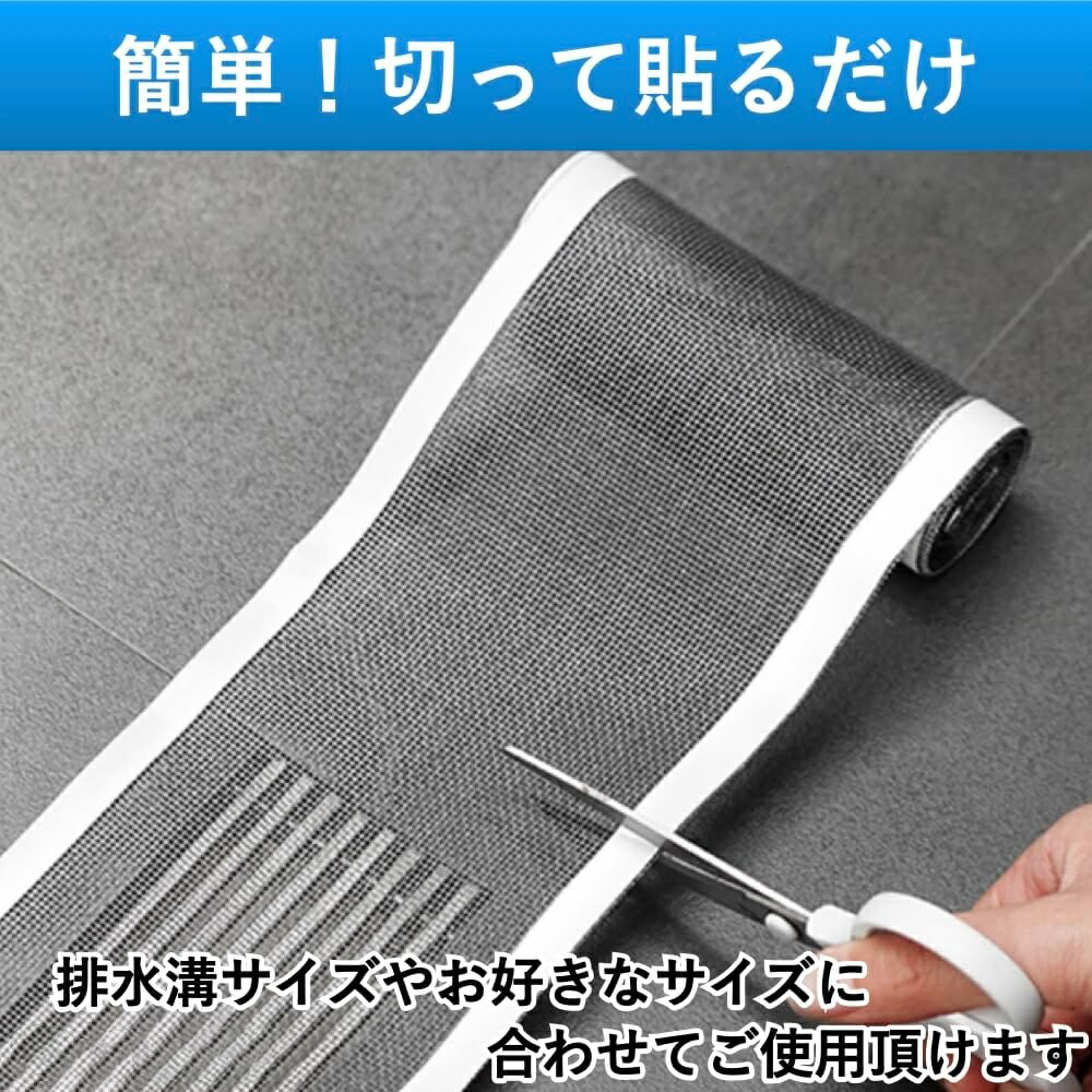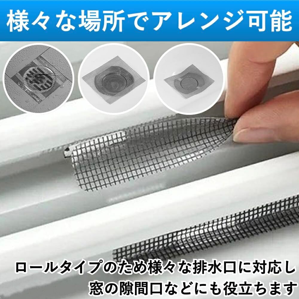 ロールタイプになっているためお好きなサイズに裁断することで様々な排水口に対応します。窓の小さな隙間口などに貼り付けて加工することも可能です。シンクや洗面台などで排水口のヘアキャッチャーとしてだけではなく、ベランダやバルコニーの排水溝にも設置できます。また、レストランや居酒屋、ラーメン店などの飲食店の厨房の側溝に設置できます。ホテルや旅館、ジムやプール、漫画喫茶などのシャワー室、ペットのシャンプーを行う水場など様々な場所で役立ちます。