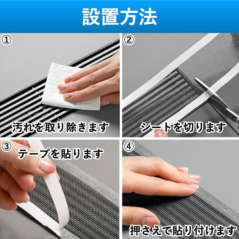 1、設置面の汚れを取り除きます。2、メッシュシートをハサミなどでお好みのサイズに切ります。3、シート裏面の剥離紙を剥がします。4、設置面に貼り付けて、上から押さえつけてシートを貼り付けます。