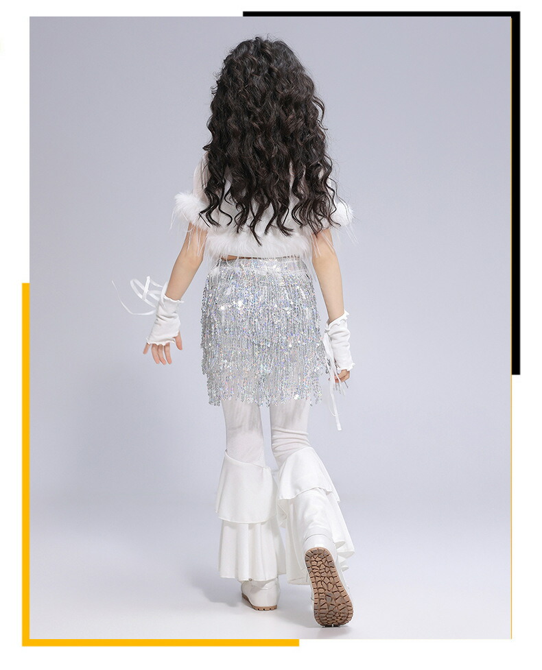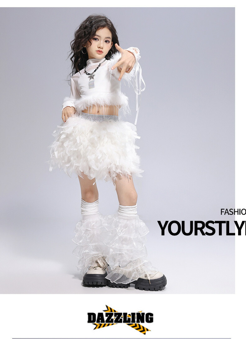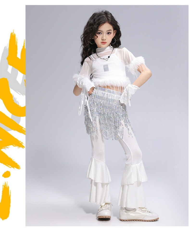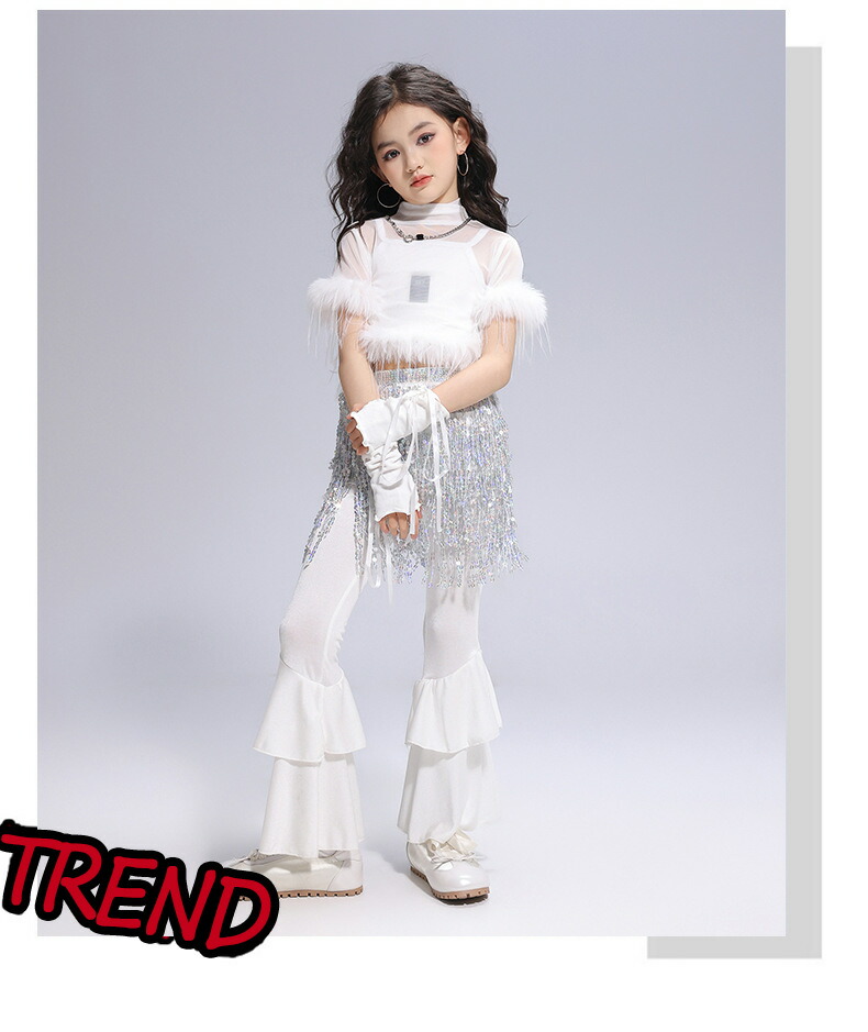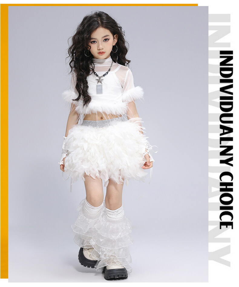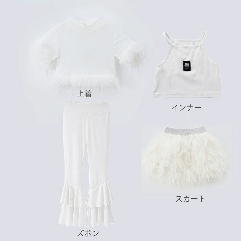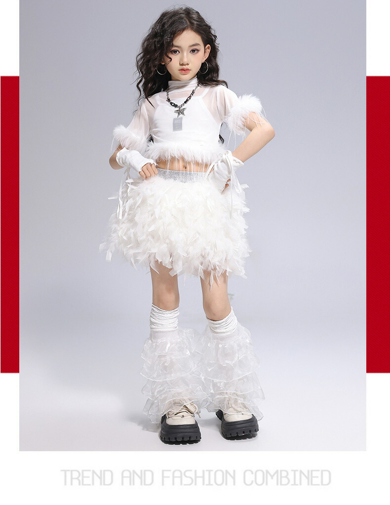 へそ出し トップス 白 半袖 シルバー ダンス衣装 セットアップ スカート ひざ丈 スカートスーツ ガールズ衣装 HIPHOP衣装 キッズ 可愛い ストリート K-P 韓国子供服