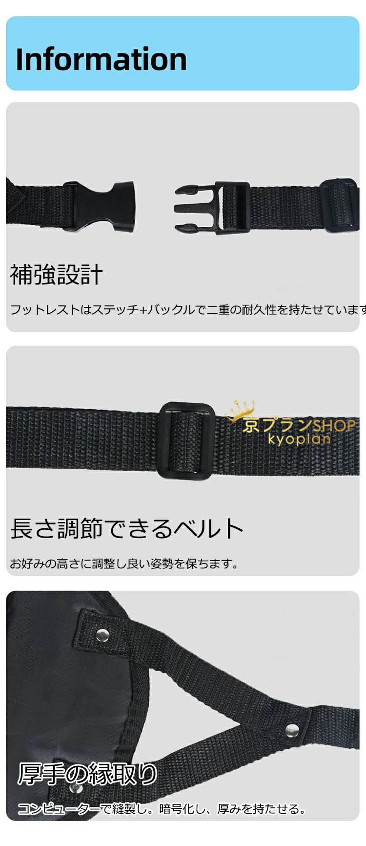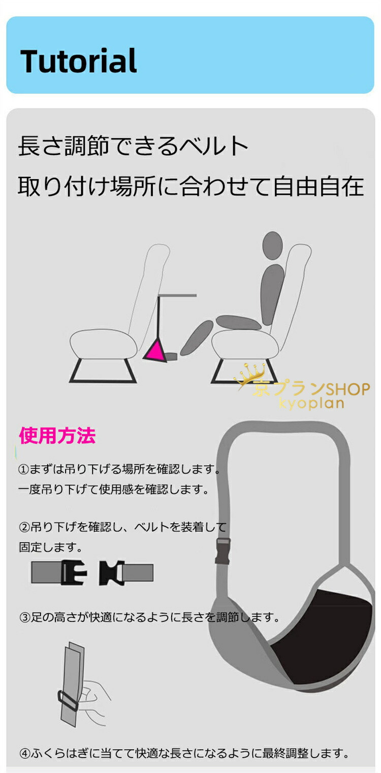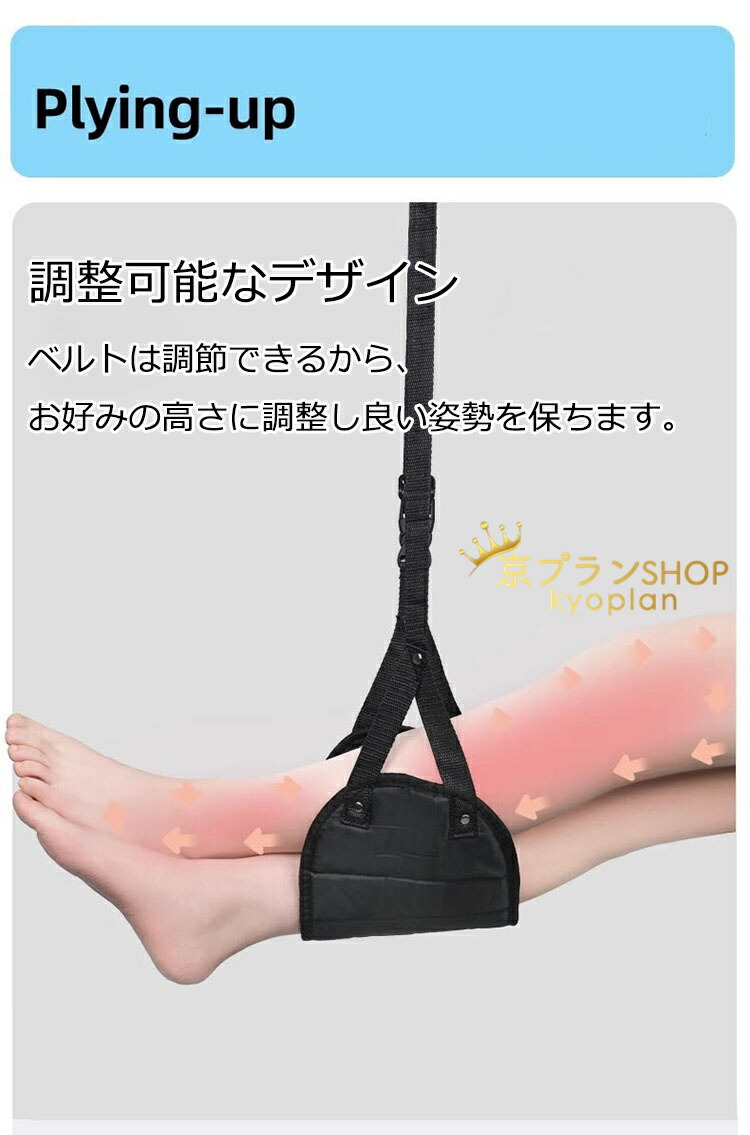 フットレスト 前の座席に引っ掛けるだけで簡単に取り付けることができます。お好みの高さに調整して、快適な姿勢を保つことができます。