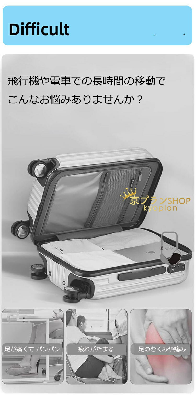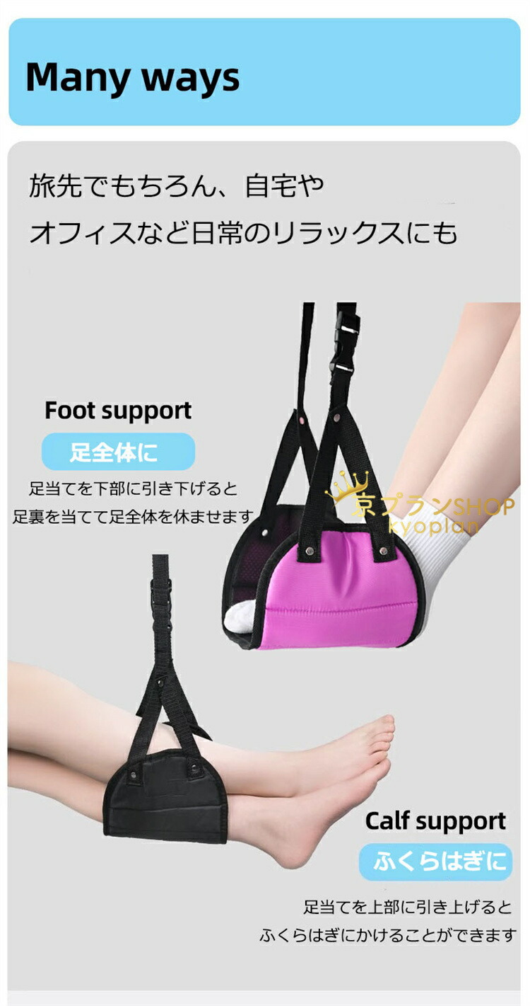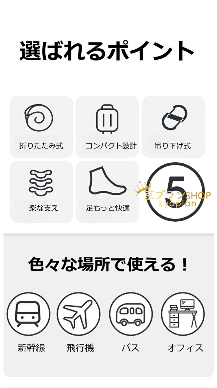 フットレスト 足のケア(フットケア)が重要であり、足の負担を軽減し、むくみなども緩和します。長時間のフライトや新幹線の移動中でも、足の裏やふくらはぎを乗せることでリラックスした姿勢を保つことができます。旅行や出張など移動中に疲労を軽減し、足のだるさやひざの痛みにも効果があります。