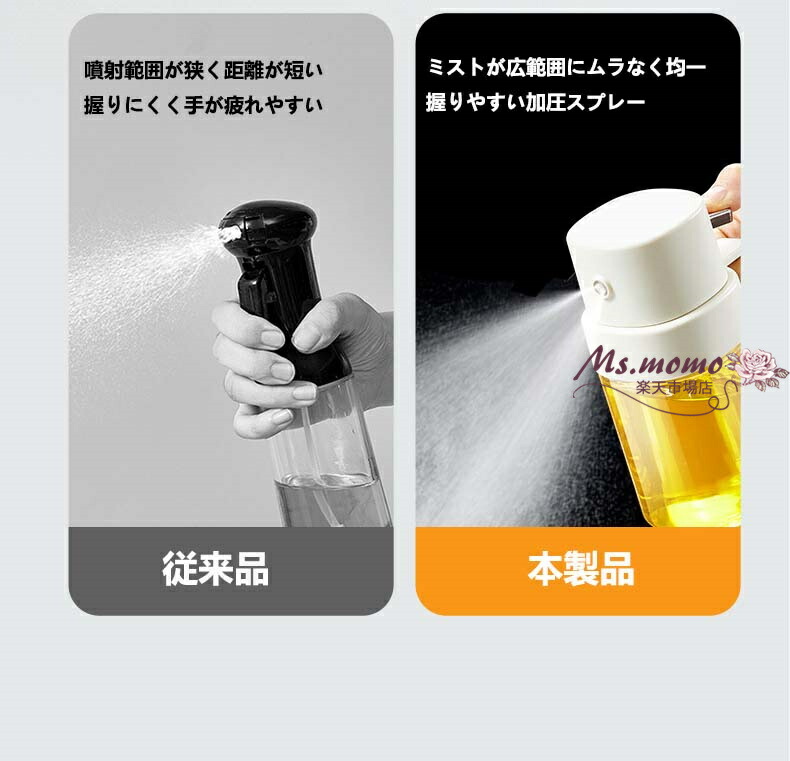 スプレーボトルを押すだけで、細かいミストが広がります。失敗知らずの料理に!均一なミストで油の過剰使用を回避し、おいしい料理を楽しめます。広く使われています