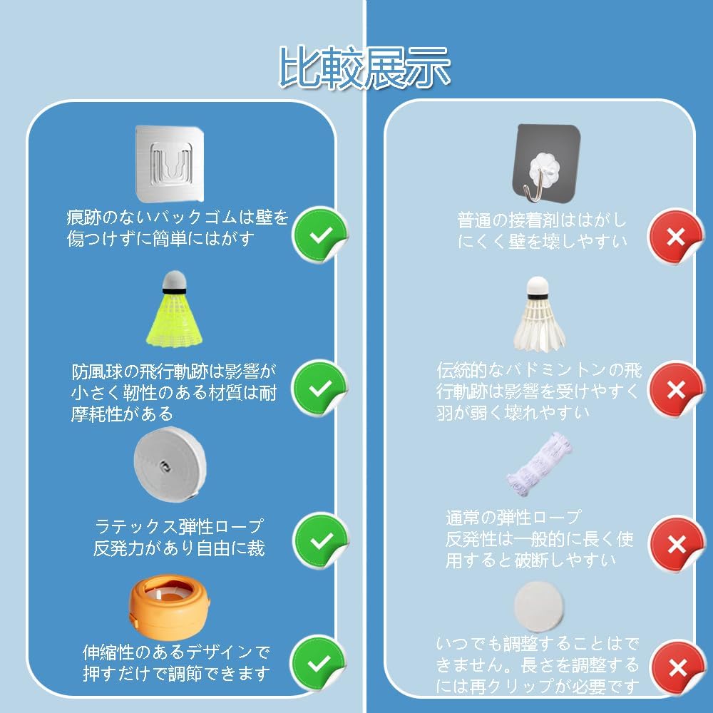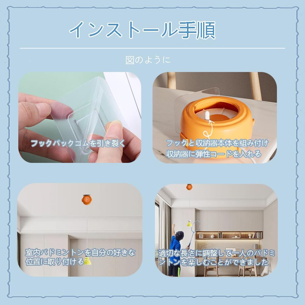 【多くの場所で適用する】:練習バドミントンは子母ボタン貼り付け設計を採用し、積み下ろしが便利で、壁を傷つけず、しかも複数の母ボタンを持って、多くの場所に貼り付けることができて、1つ1つを押しても外れず、迅速で安心です。屋内外のあらゆる場所での利用に最適で、自宅のリビング、公園の広場、ジムの一角など、場所を選ばずに利用できます。どこにいても練習のチャンスを逃さない。
