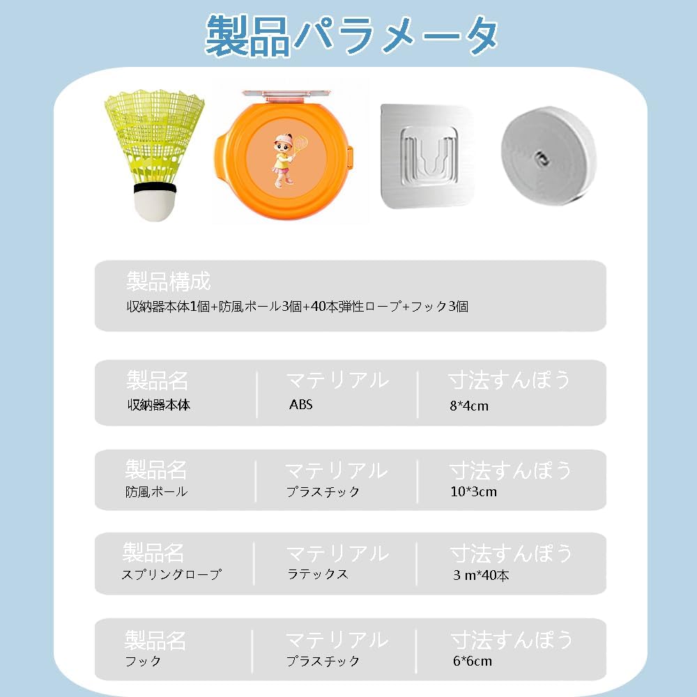 収納式本体×1(カラーランダム)、バドミントンボール×3(カラーランダム)、フック×3、伸縮ロープ×40