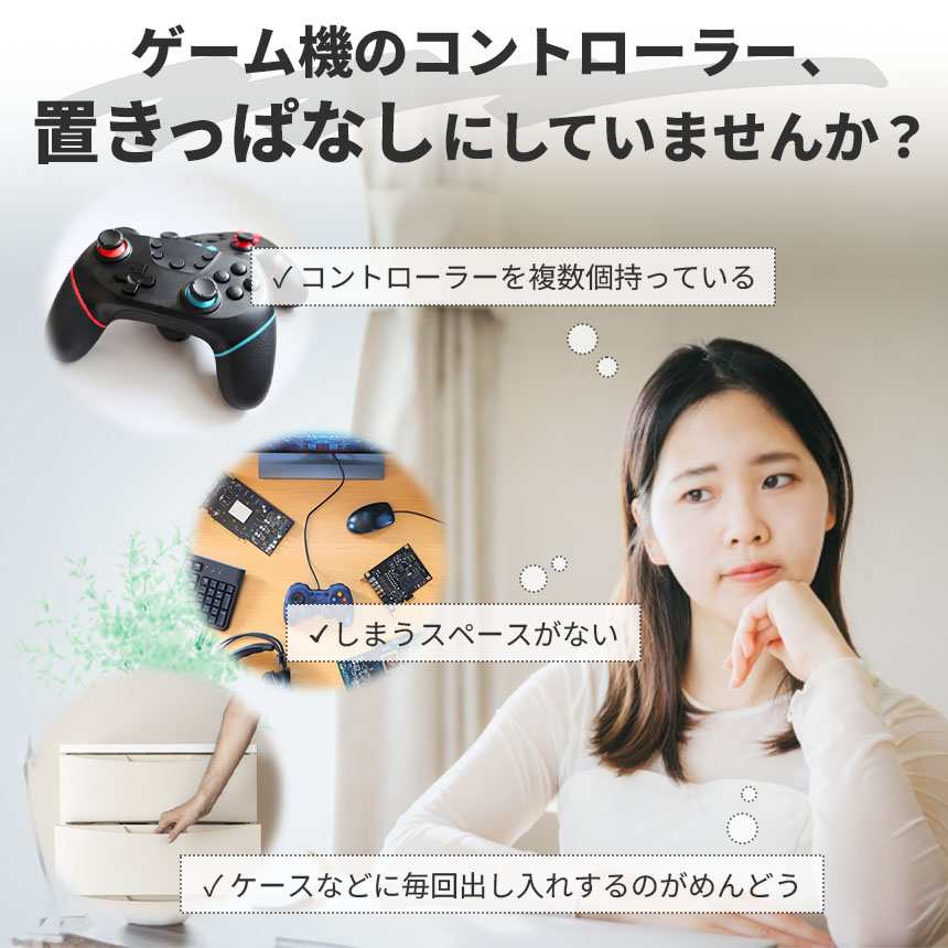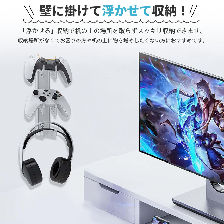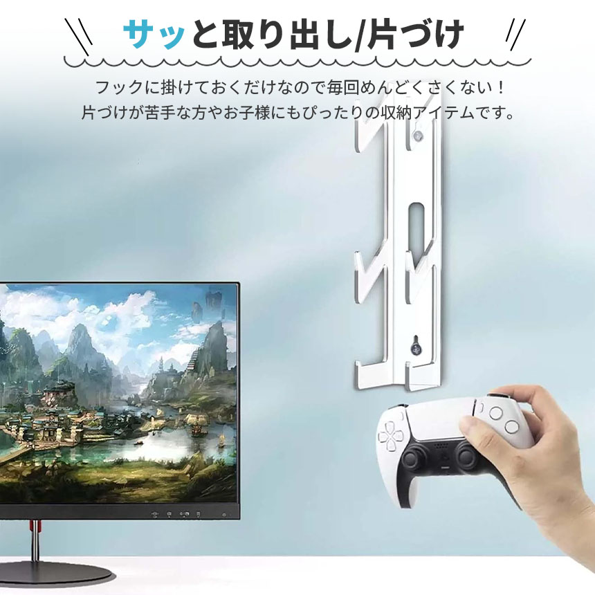 ゲームをする際に使うコントローラーやヘッドホン、イヤホンなどを壁に掛けて収納できる便利収納アイテムです。