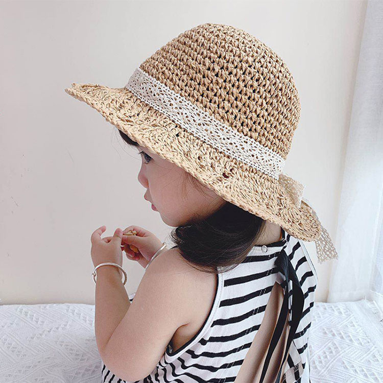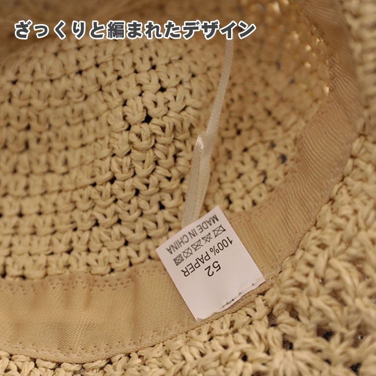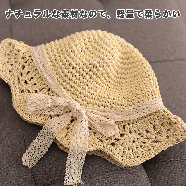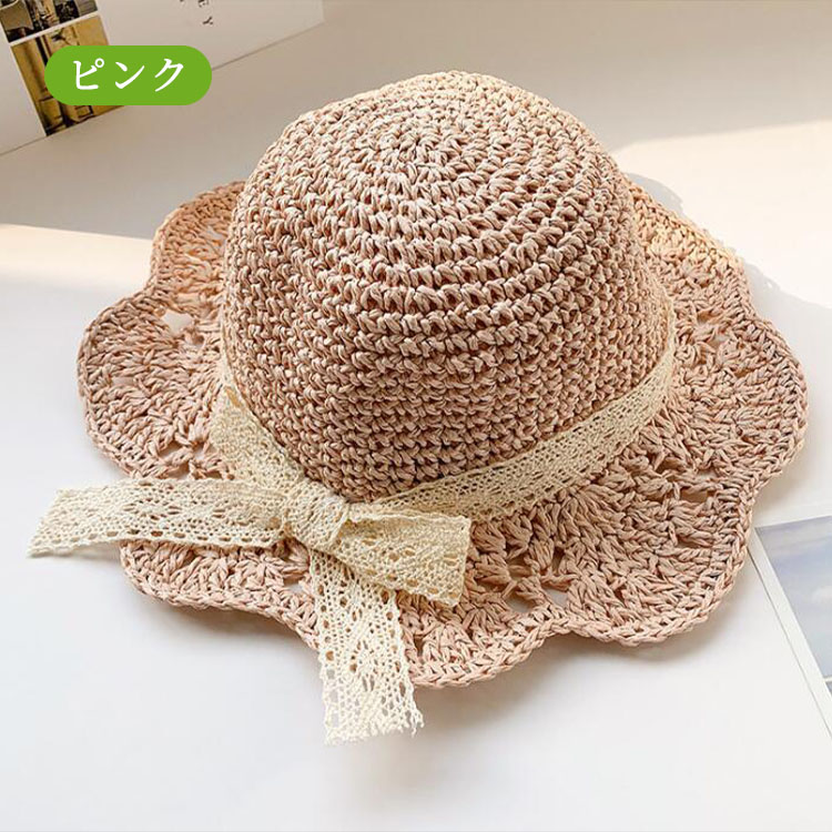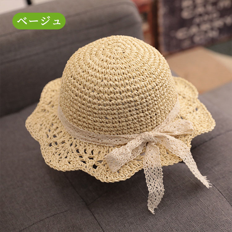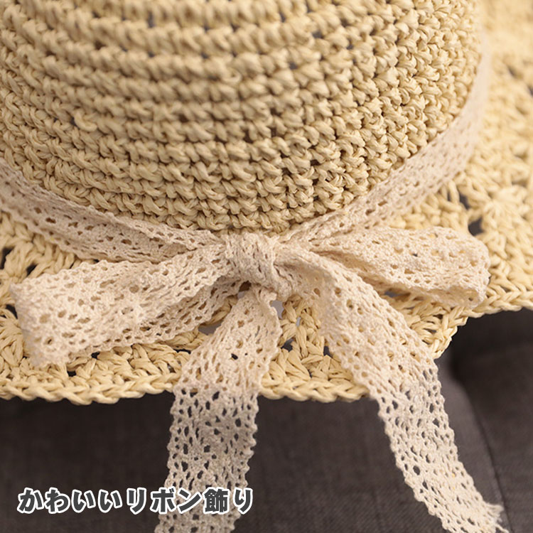 麦わら帽子 キッズ ガールズ 女の子 かわいい リボン飾り つば広 ストローハット 子供 UVカット 帽子 おしゃれ 折りたたみ 蝶結び 春 夏 ビーチ キャンプ 旅行 日焼け止め 写真撮影 46 海