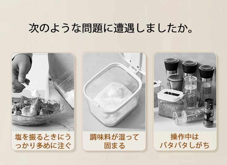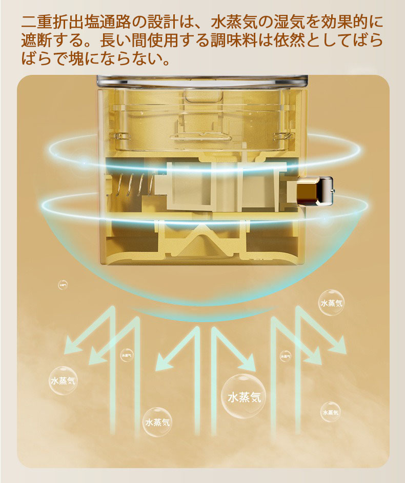 防塵・防湿ホルダー:防塵・防湿設計を特徴とするこれらの容器は、スパイスや調味料を長期間新鮮で風味豊かに保つことができます。塊状の塩やねっとりとした砂糖に別れを告げましょう。
