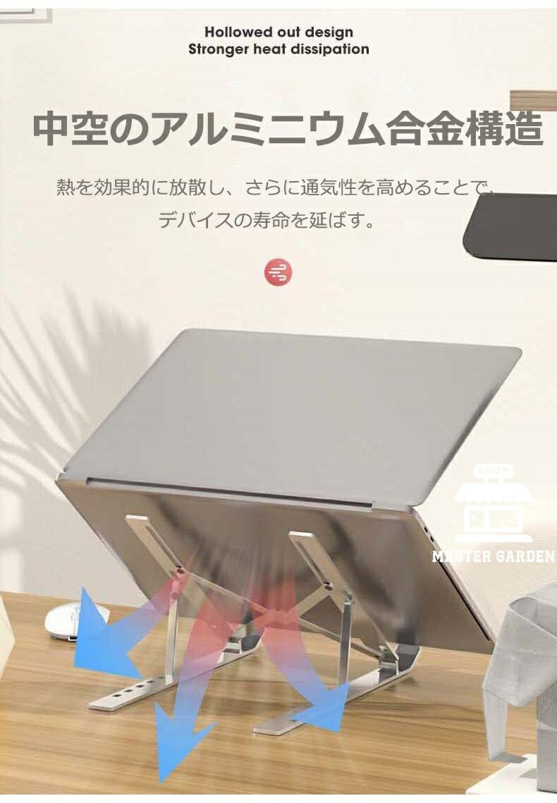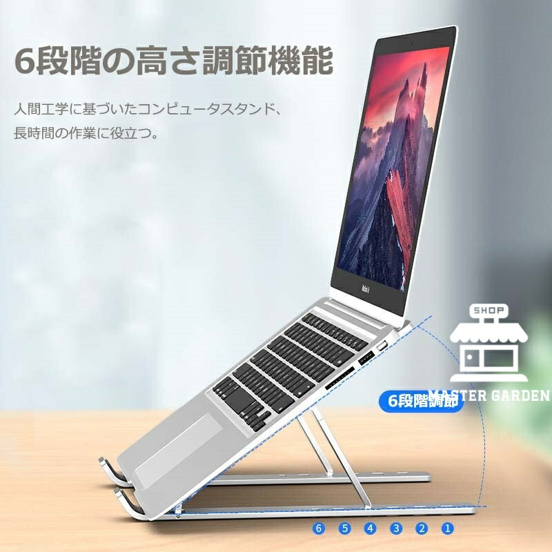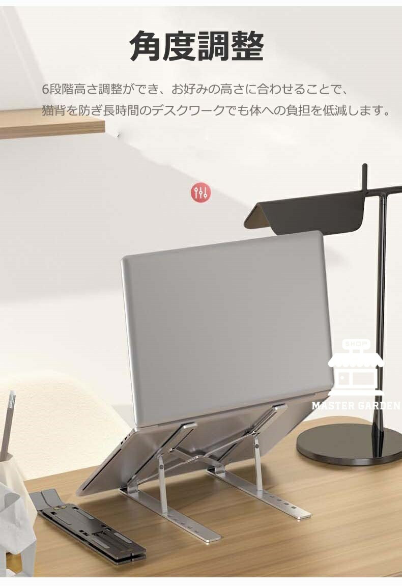 ノートパソコンスタンド タブレット PCスタンド 6段階調節 パソコンスタンド 折りたたみ式 アルミ 縦置き アームトレー ホルダー pcスタンド 高さ 角度調節 軽量 テレワーク