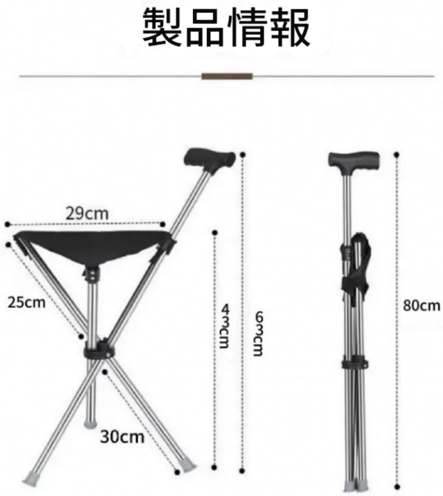 【二役一体型 折りたたみ杖】この多機能登山ストックはステッキにも椅子にもなり、1台で2役のステッキチェアです。杖椅子は、登山や散歩する時の杖にするだけでなく、疲れたら椅子にすることもできます。折りたたみステッキの長さは使用者の身長に合わせて自由に調整られます。シート付き杖は複雑な手順を踏まずに両手で簡単的に椅子に変形させられます