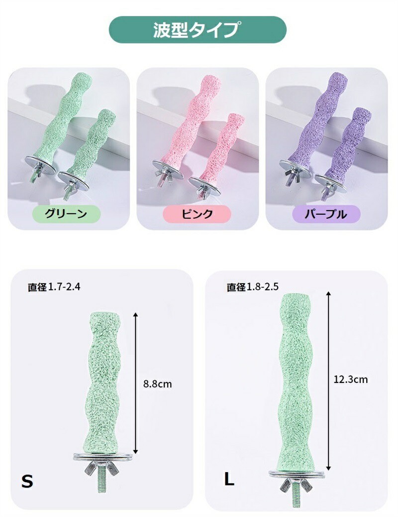 豊富な形状とカラーバリエーション: ストレート型、ウェーブ型、プラットフォーム型など、 複数の形状をご用意。 様々な止まり方で鳥さんを飽きさせません。 カラーは3色展開で、ピンク、グリーン、パープルのかわいい色合いです。