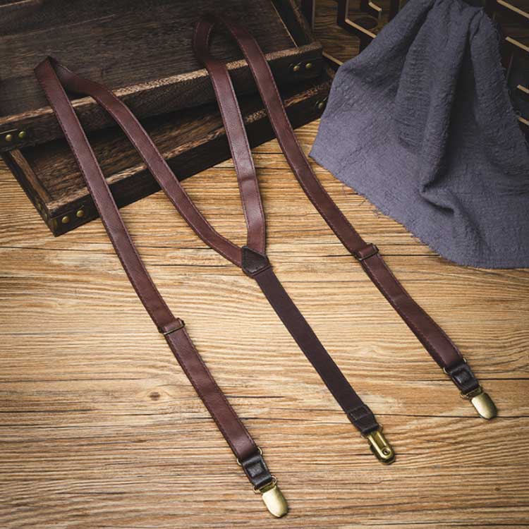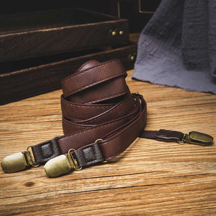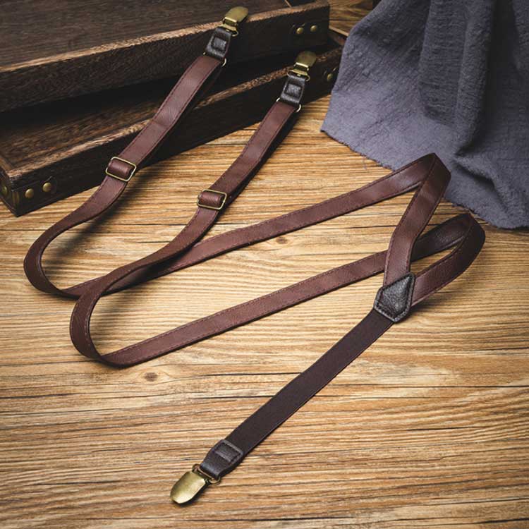 「おしゃれなレザー調」幅2.5cmのでオシャレに見えるレザー調のサスペンダーです。弾力性・柔軟性が高くしっかりとした作りで耐久性もあり、高級感のある見た目です。