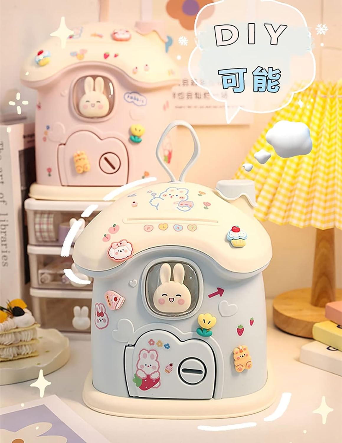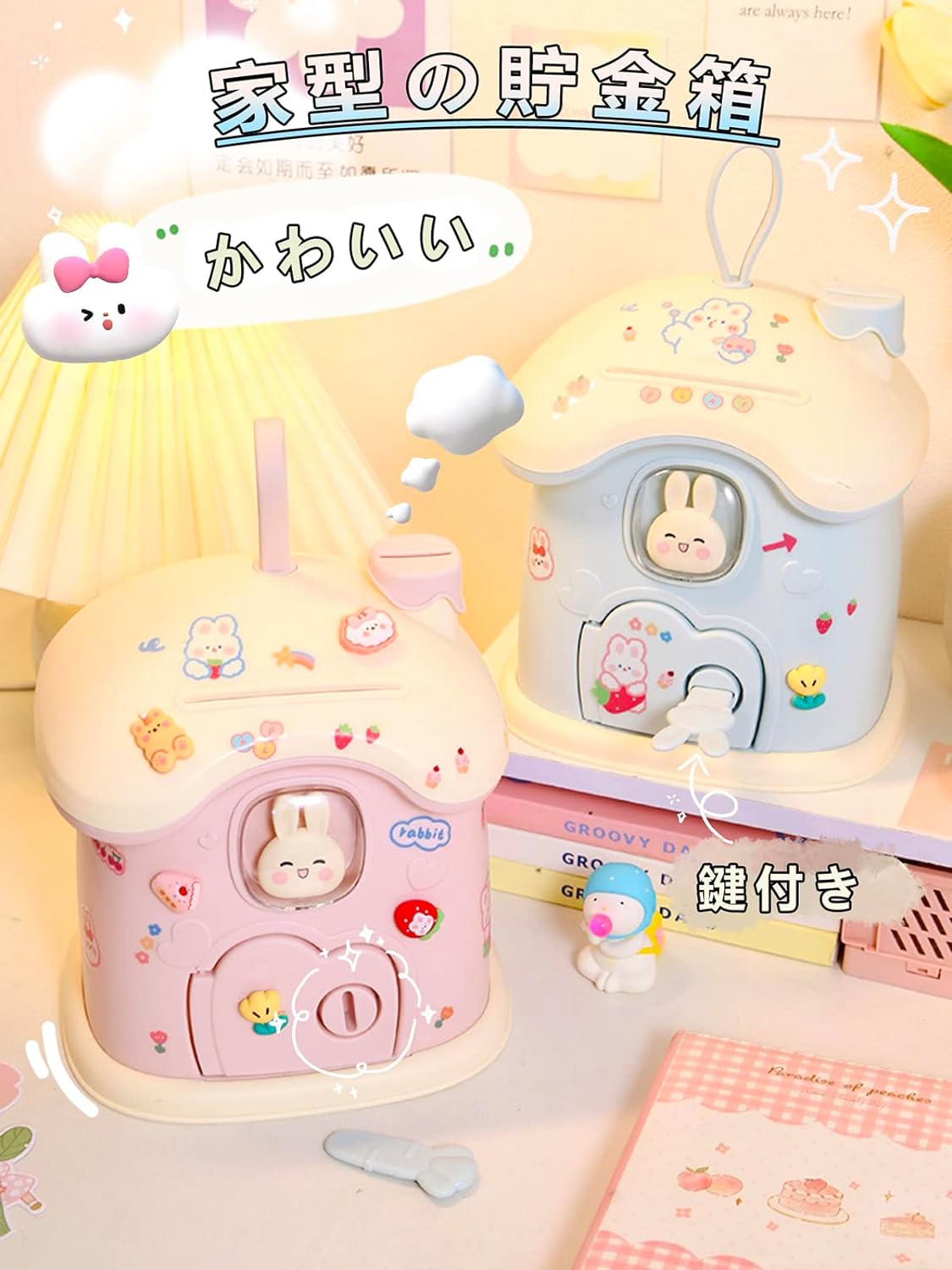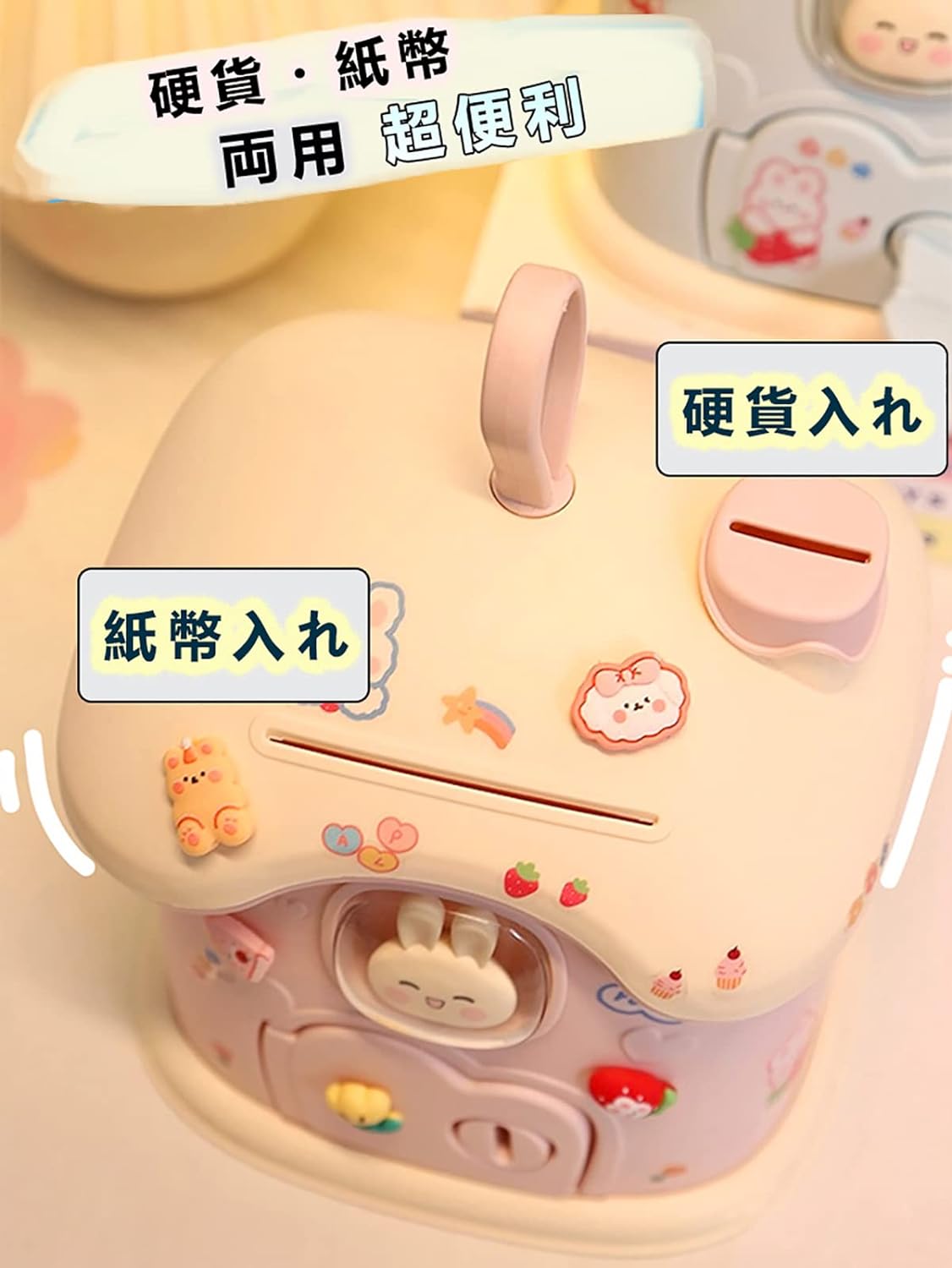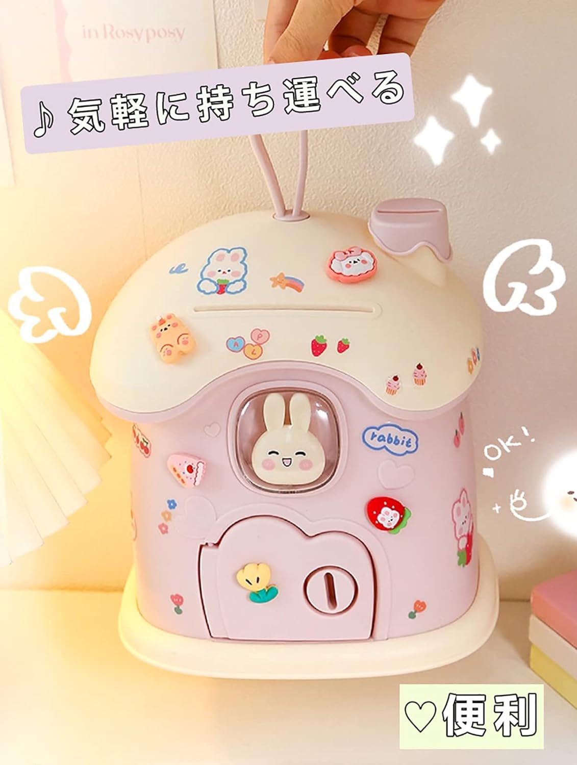 貯金箱 お札 かわいい いうさぎの形 DIY可能 3D 動物 シール付き 鍵付き 手提げ貯金箱 硬貨 折らずに入る 紙幣 両用 女の子 男の子 おしゃれ 小銭ボックス 家型 父の日 子供用