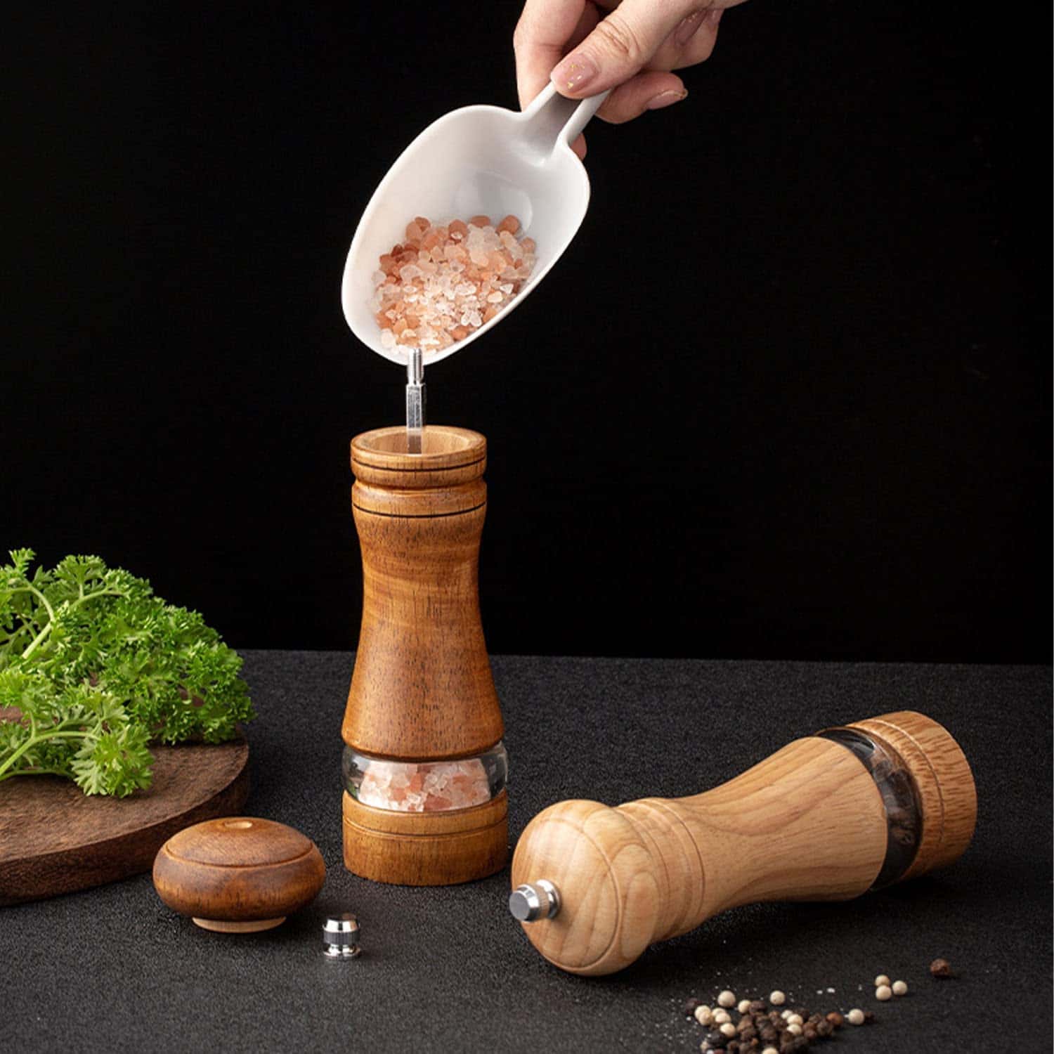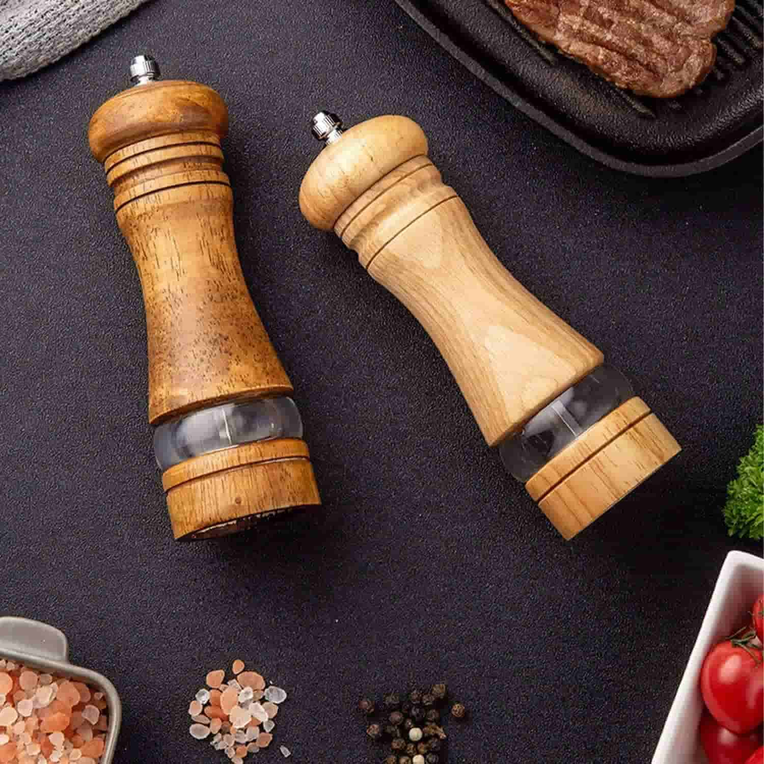 2本セット 木製ペッパーミル 塩胡椒 ミル 手動 詰め替え可能 天然木 結晶塩 岩塩 香辛料 調味料ミル 操作簡単 天然 無垢材 セラミック 調味料用 キッチン用品 父の日 スパイス