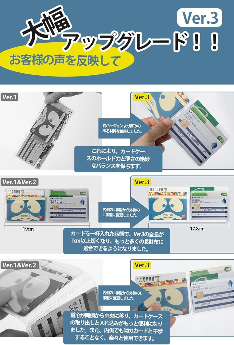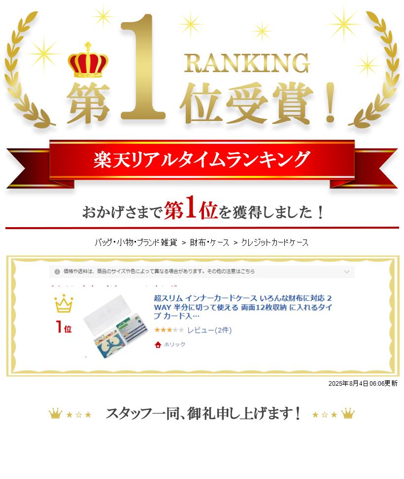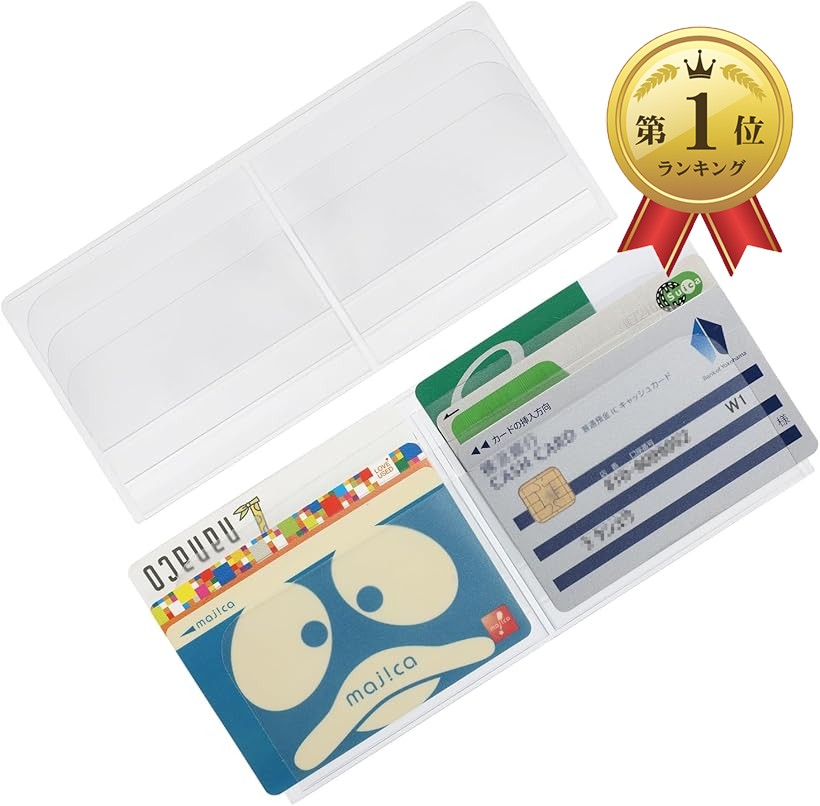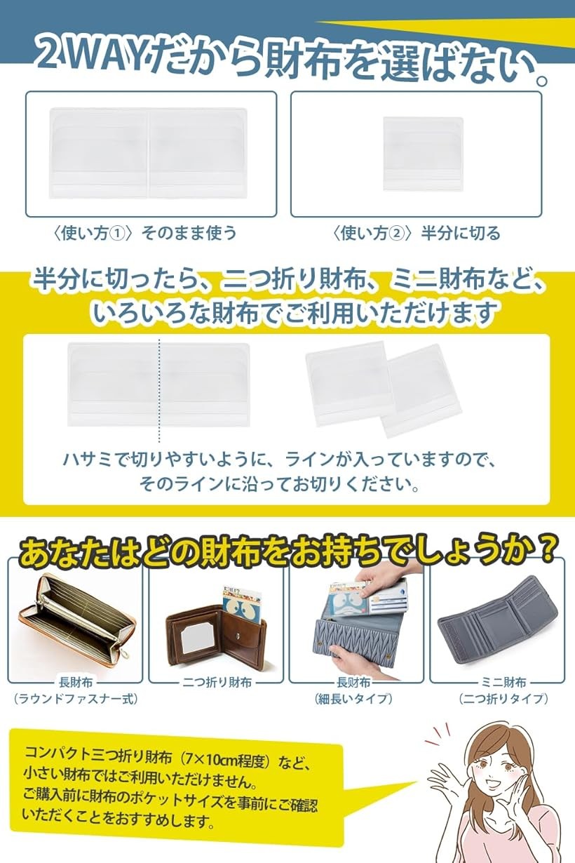「 薄さ x 収納力 」 [サイズ]そのまま使う:17cmx7.7cm | 半分に切る:8.5cmx7.7cm 厚み0.1cm [重さ]約13g [カラー]半透明 [収納枚数]最大12枚 財布のサイズを事前にご確認の上、ご購入ください。