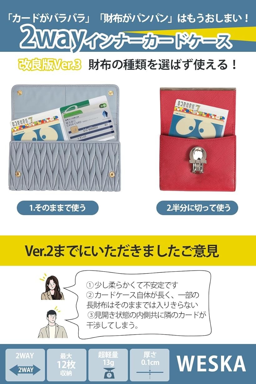 超スリム インナーカードケース いろんな財布に対応 2WAY 半分に切って使える 両面12枚収納 カード入れ 薄型 クリア に入れるタイプ
