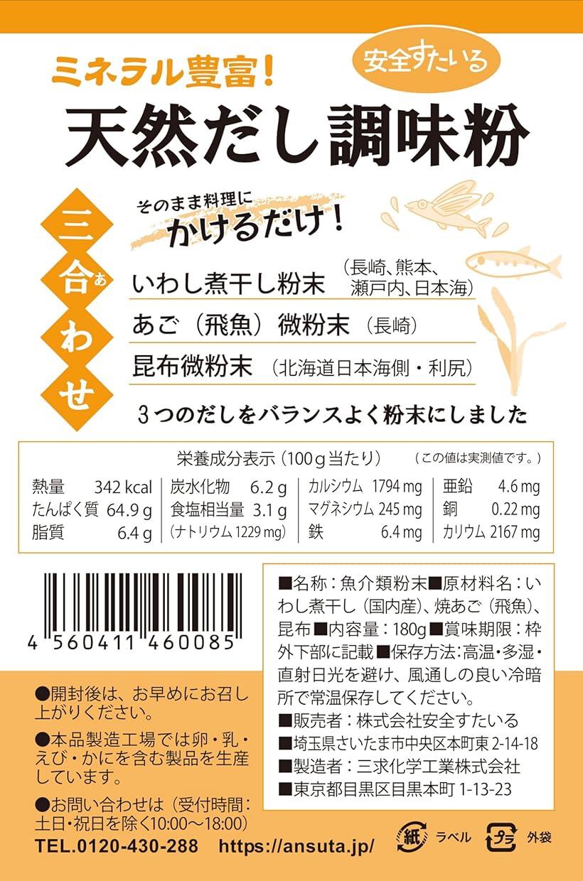 安全すたいる 天然だし調味粉 180g 無添加 粉末だし 国産原料100% いわし煮干し + 焼あご + 昆布 x1袋