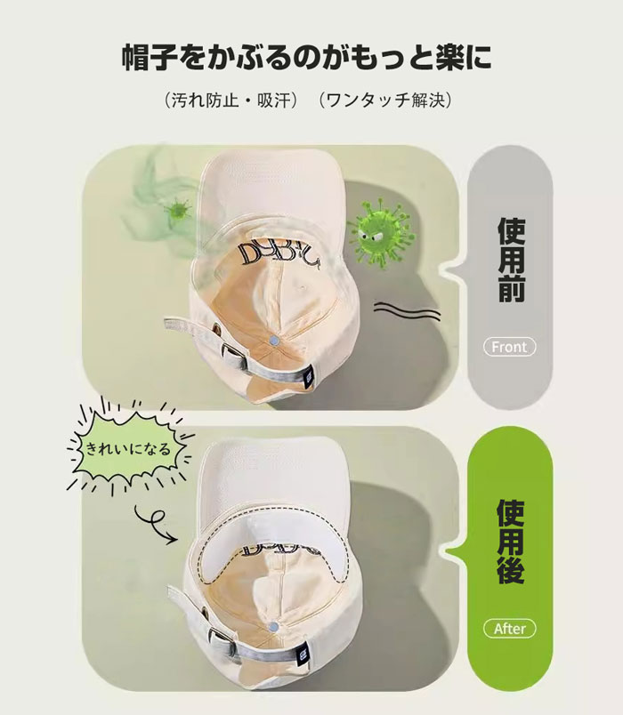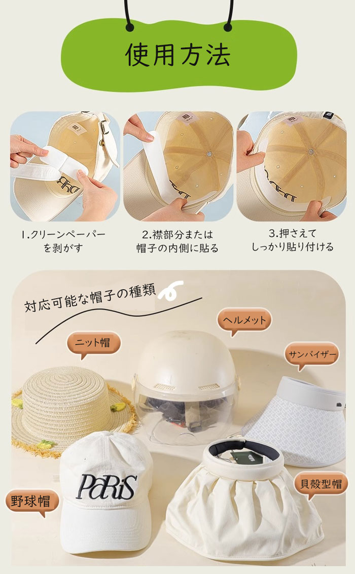 簡単な調整:帽子アジャスターバンドで帽子をぴったりとフィットさせます。裏面に粘着剤が付いているバンドは、汗止めバンドの内側に簡単に取り付けられるように特別に設計されています。