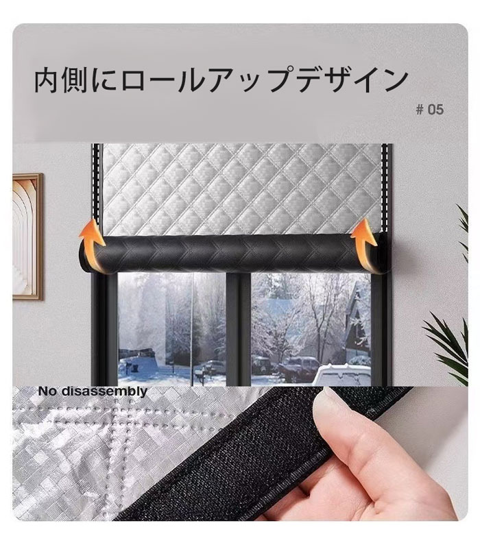 断熱素材:カバーを巻き上げて、自宅にあるクリップで固定できるので、取り外すことなく簡単に窓を開けることができ、折りたたんで収納するのに便利です。