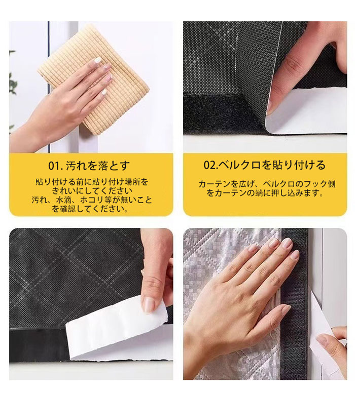 取り付け簡単: 窓用冬季対策キットは取り付けが簡単で、カーテンにはループストリップが縫い付けられており、キットには窓の周りに貼る粘着フックテープが付属しています。フックとループの側面が互いに接着するようにカーテンを置くだけです。