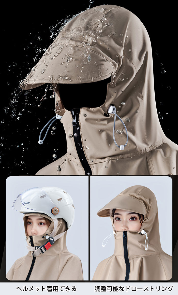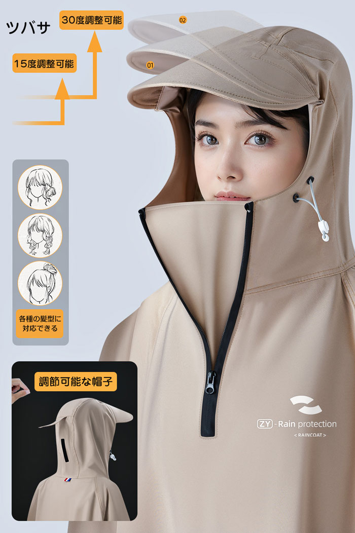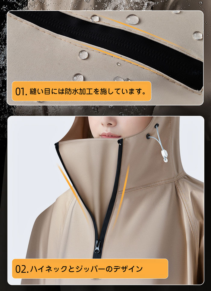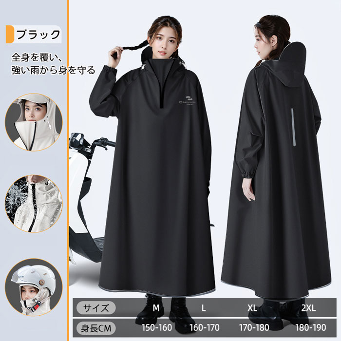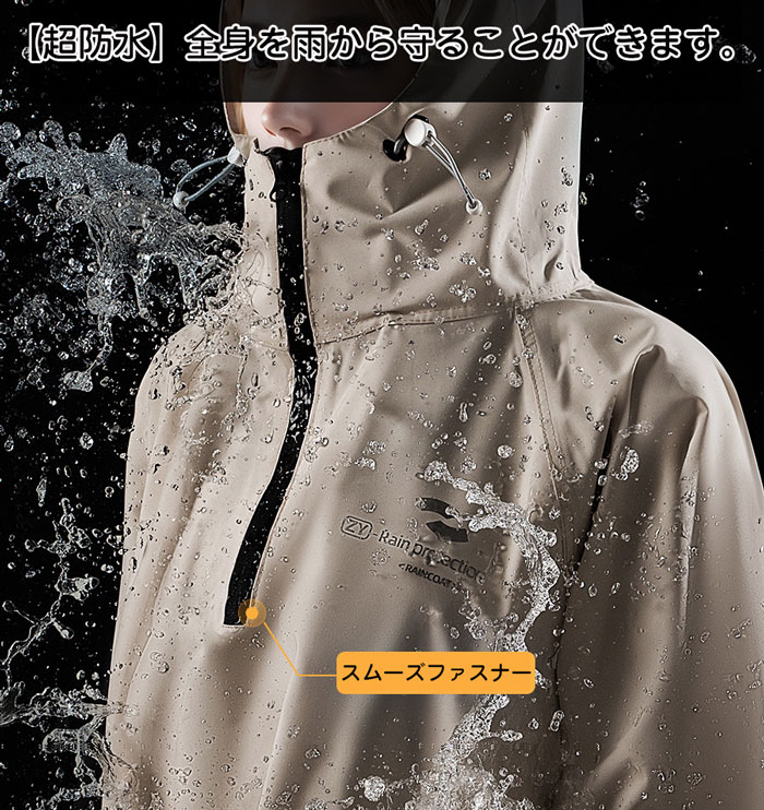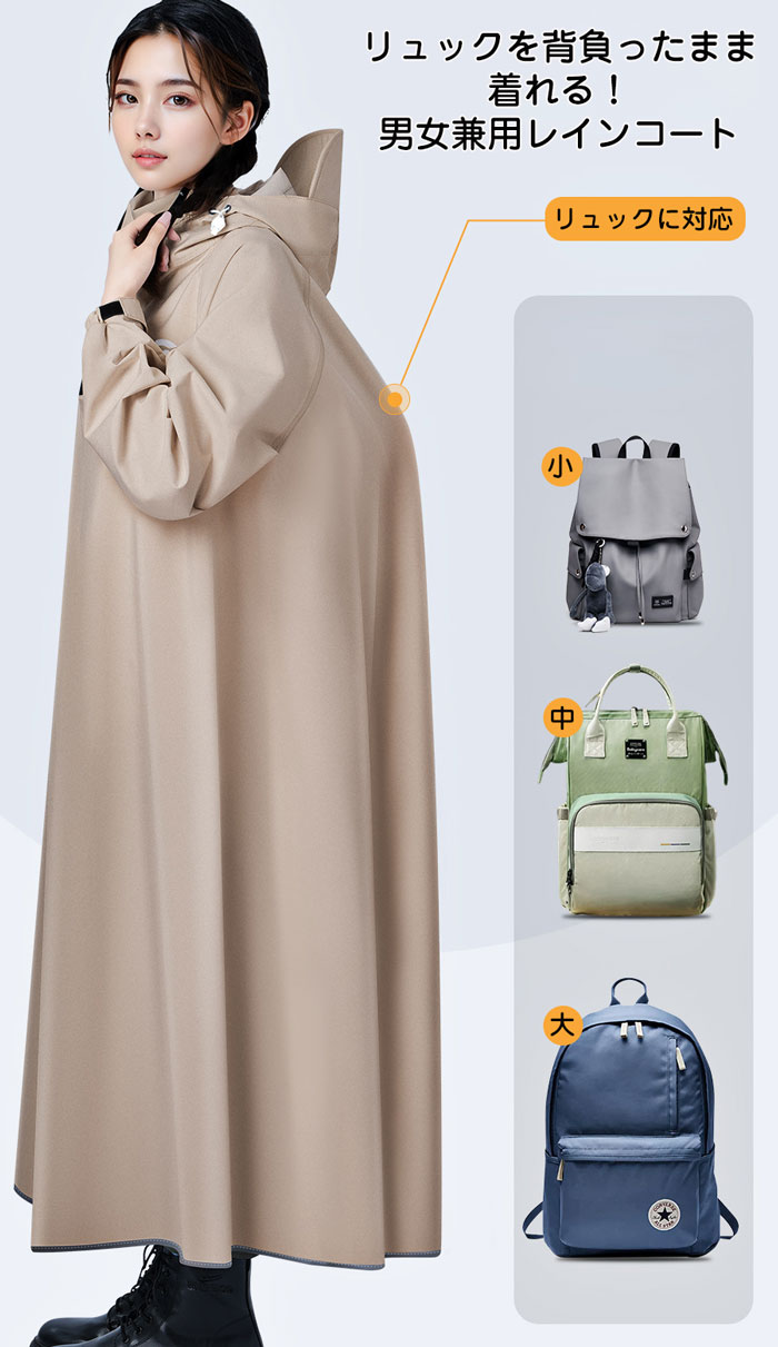 自転車、リュックに対応可能な男女兼用のレインコート。