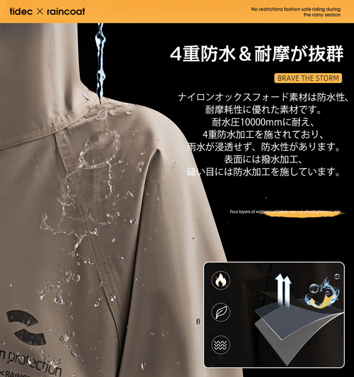 このレインコートは防水性と耐摩耗性に優れたナイロンオックスフォード素材を採用し、