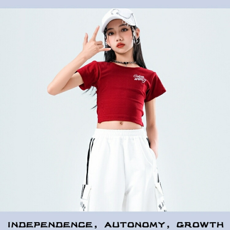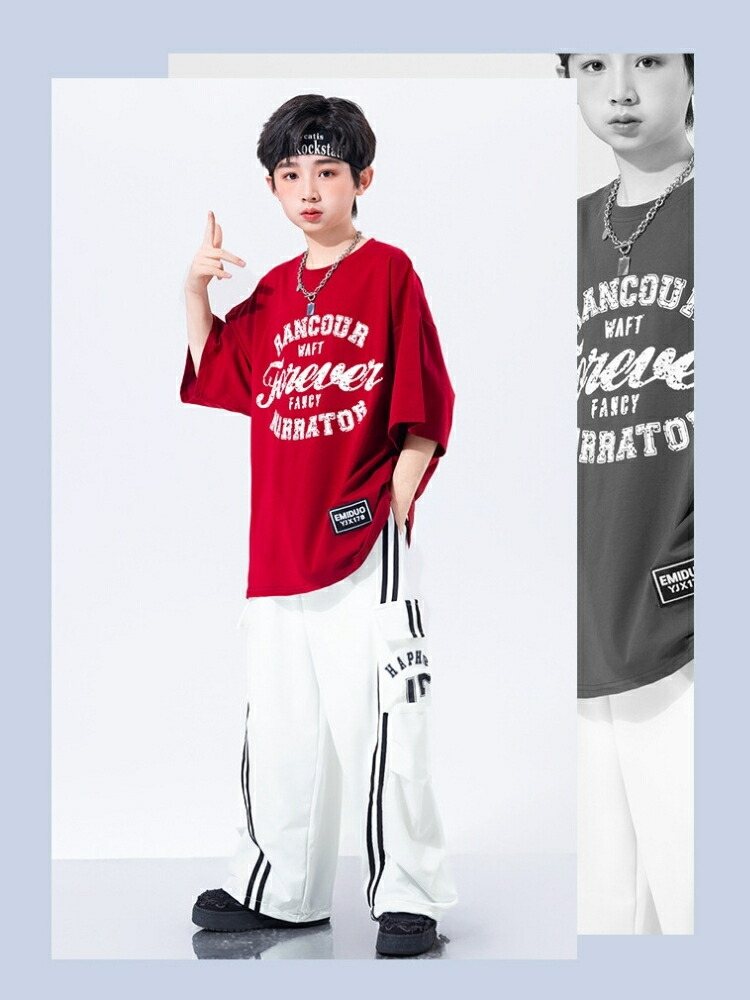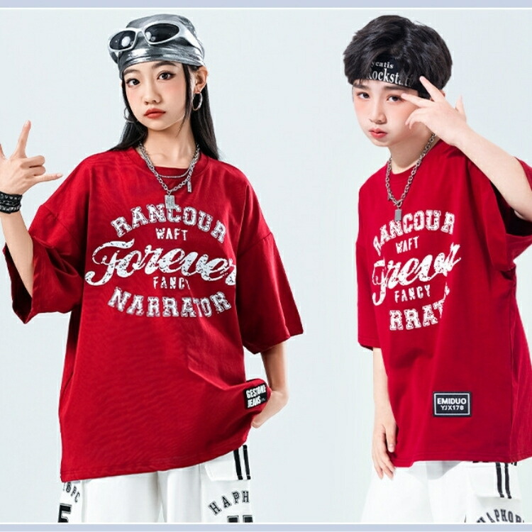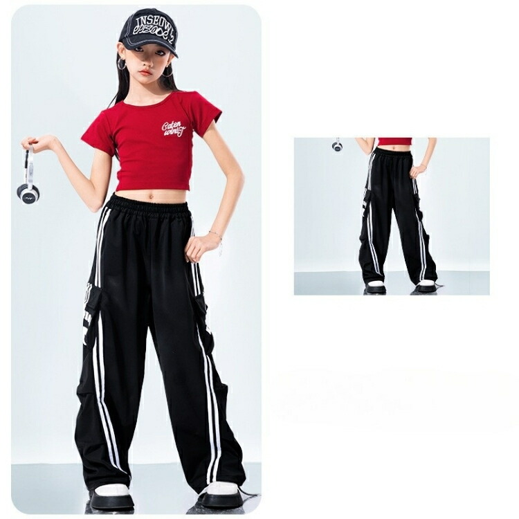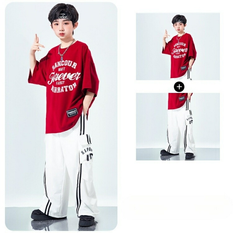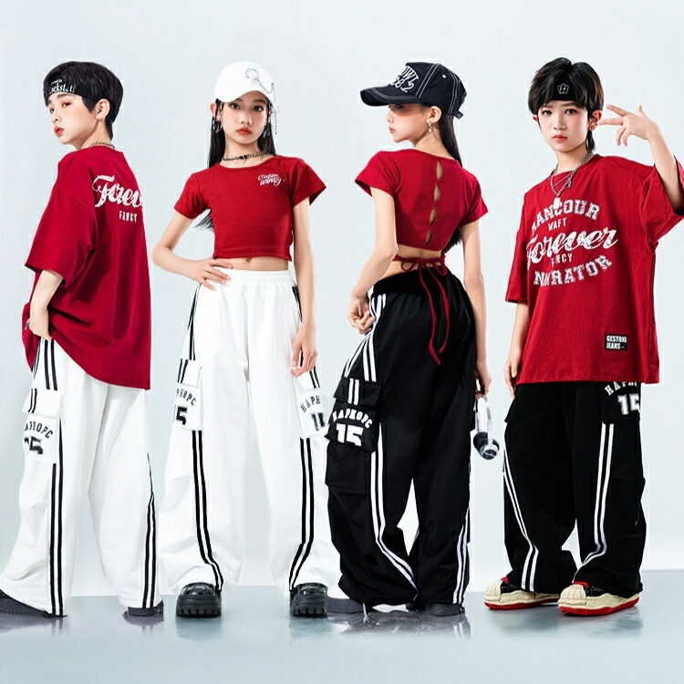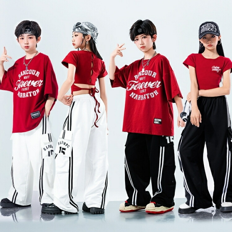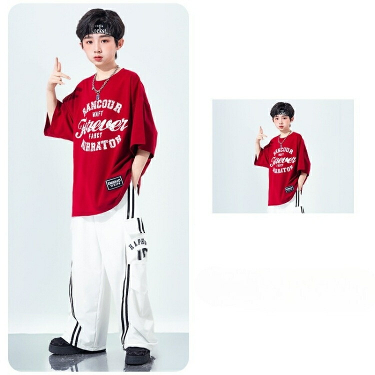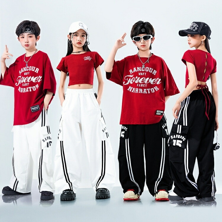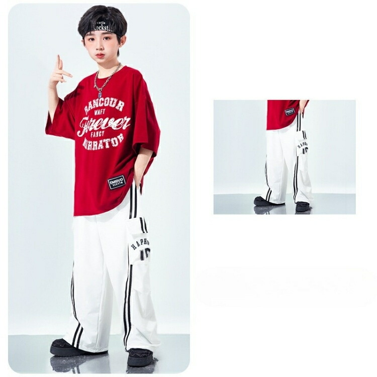 ダンス衣装 キッズ セットアップ ヒップホップ 子供服 2点セット 男の子 女の子 tシャツ 半袖 ワインレッド スポーツパンツ 黒 白 ロング丈 チアダンス 練習用 ステー パンツセット