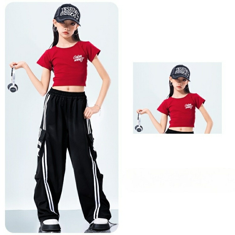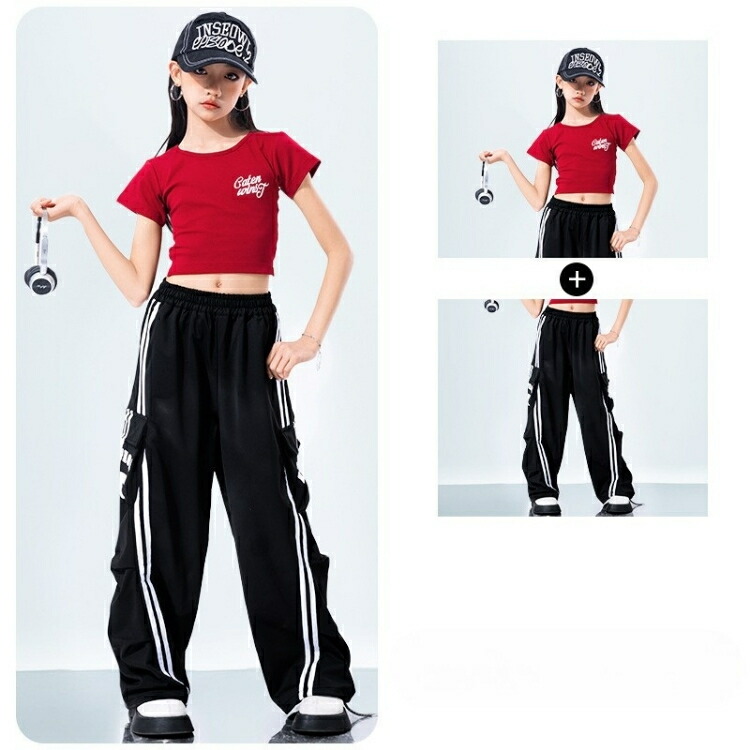 赤×黒×白のカラーリングが目を引く、キッズ向けヒップホップ系ダンス衣装セットアップ。