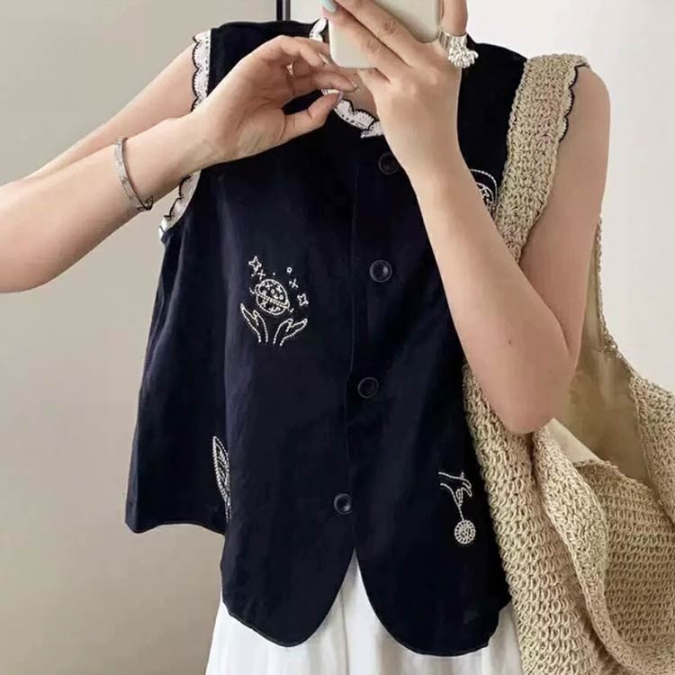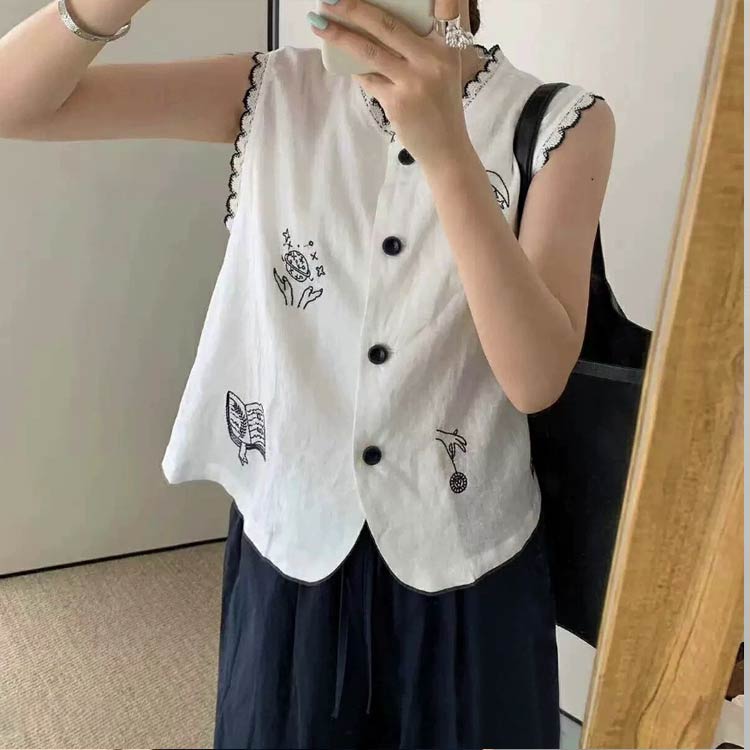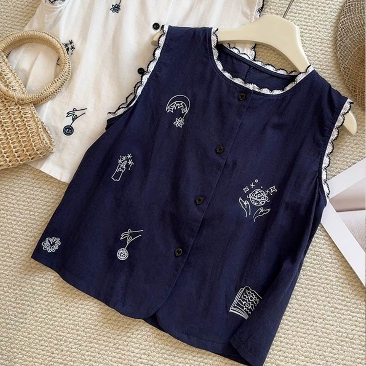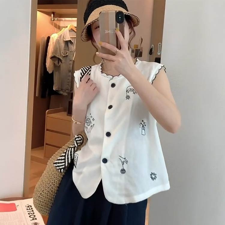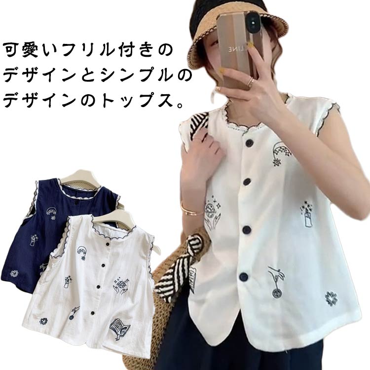 シャツ おしゃれ ノースリーブ シャツブラウス タンクトップ レディース 袖フリル 綿麻風 夏 薄手 可愛い 前ボタン トップス ホワイト ネイビー 通気 柄 袖なし シンプル きれいめ