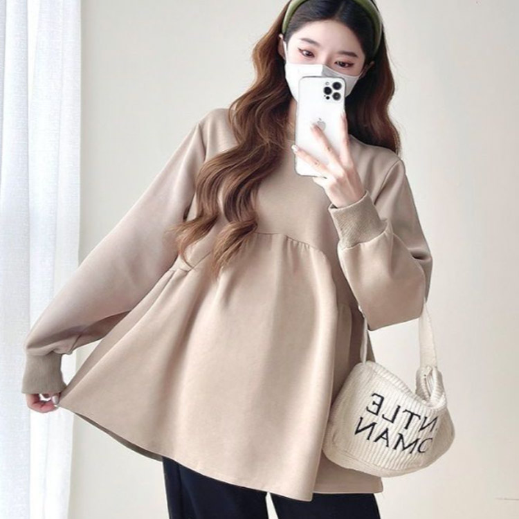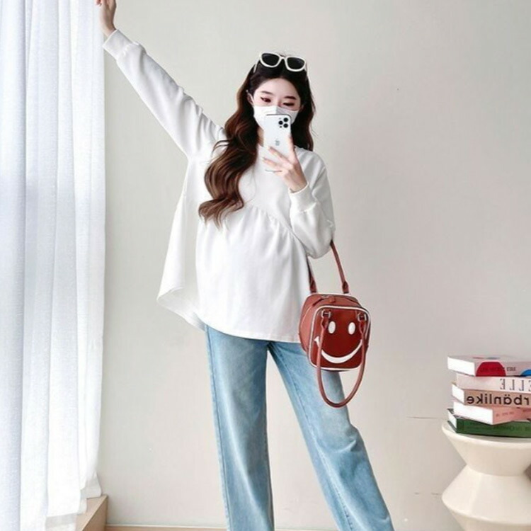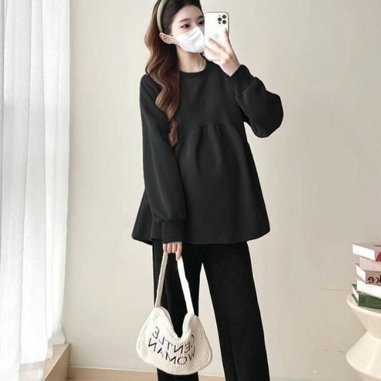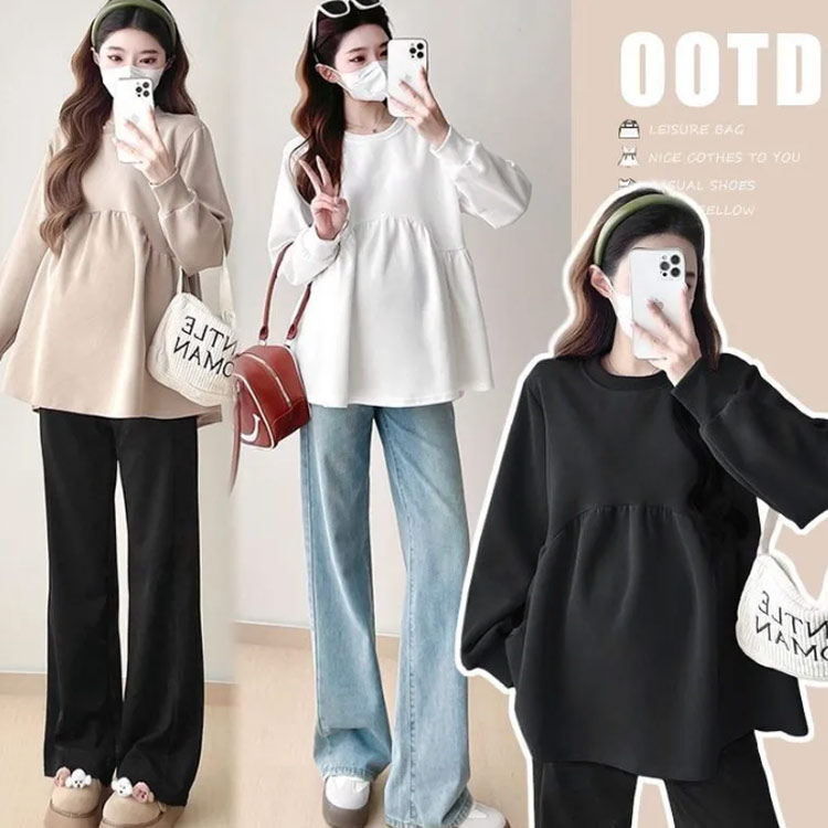 マタニティ トップス 長袖 レディース マタニティウェア ブラウス カットソー トレーナー マタニティ服 秋冬 産前 産後 クルーネック ギャザー切替 女性 体型カバー 脚長 あったか 春夏 ゆったり