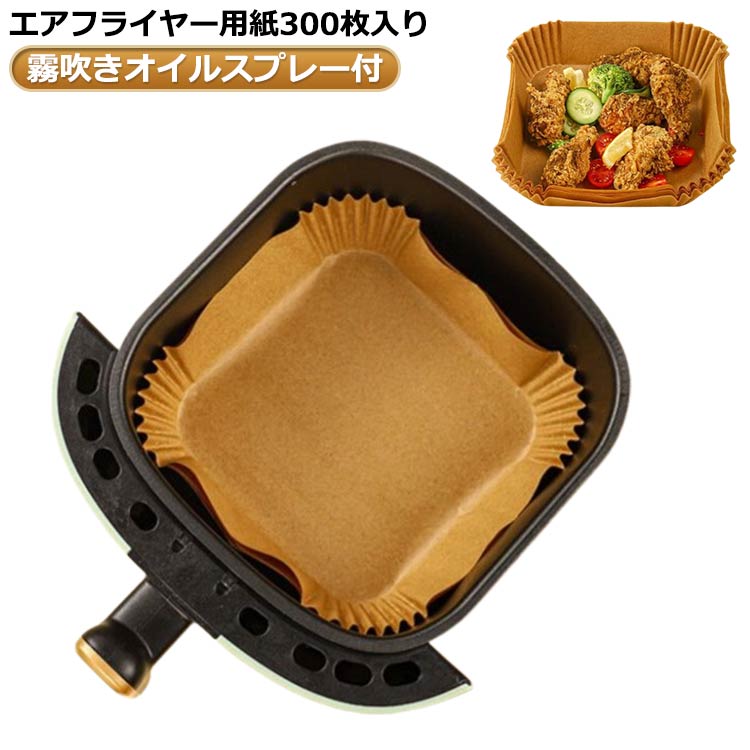 エアフライヤー用紙 霧吹きオイルスプレー付 300枚入り クッキングシート スクエア型 お菓子 エアフライヤー専用紙 防水 油紙 キッチン専用 耐油 230℃耐熱 ケーキ 天ぷら敷紙 使い捨て 揚げ物