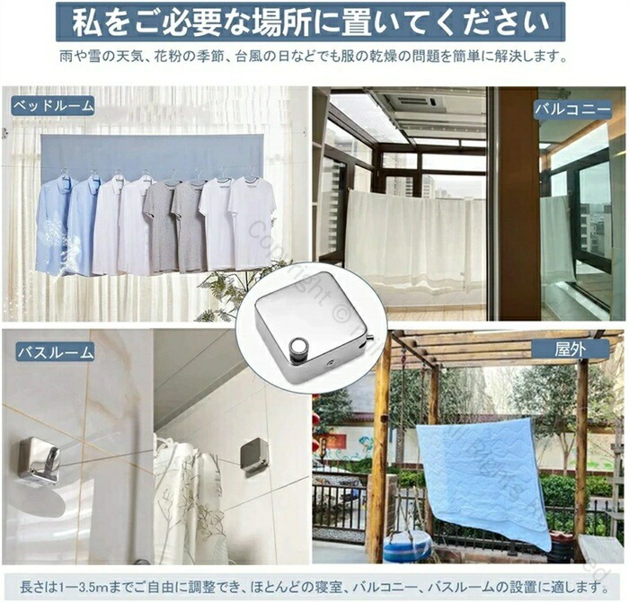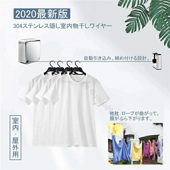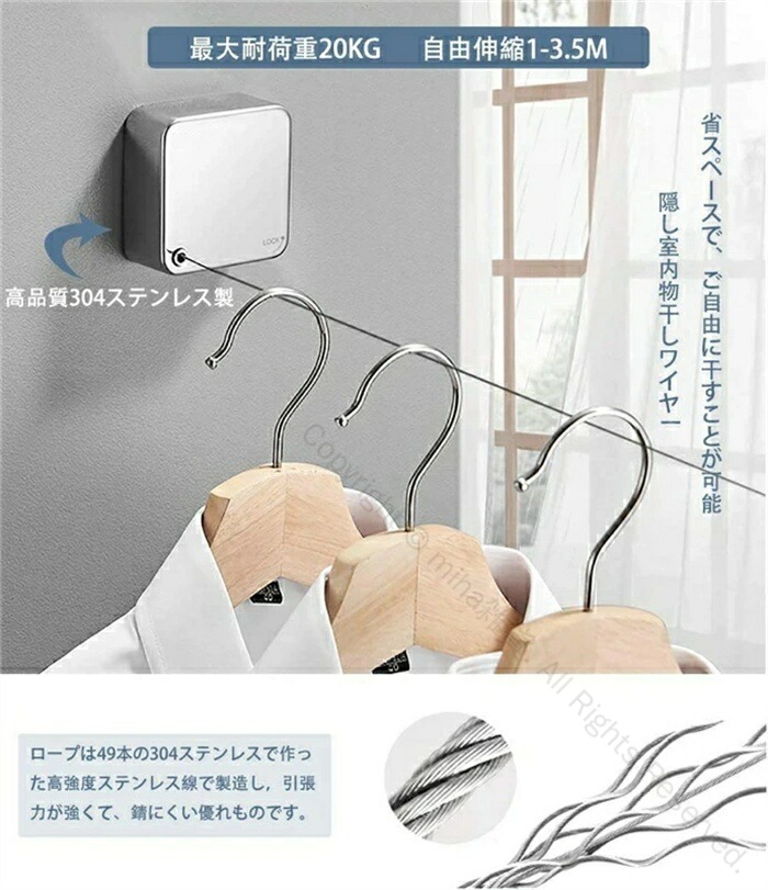 304ステンレス製 室内物干しワイヤー 部屋干し用洗濯物干しロープ 自由伸縮タイプ 穴開け不要で簡単設置 防水防錆仕様 室内外兼用 耐荷重20KG対応 壁付け省スペース収納