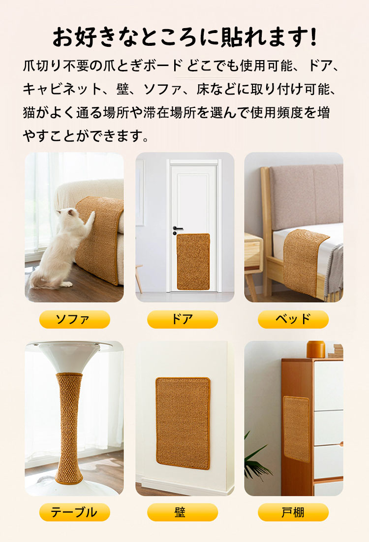 ※多用途:爪切り不要の爪とぎボード どこでも使用可能、ドア、キャビネット、壁、ソファ、床などに取り付け可能、猫がよく通る場所や滞在場所を選んで使用頻度を増やすことができます。 猫ベッド兼猫マットでもあり、猫が食事や遊びの際に直接地面に横たわらず、猫の風邪予防に!