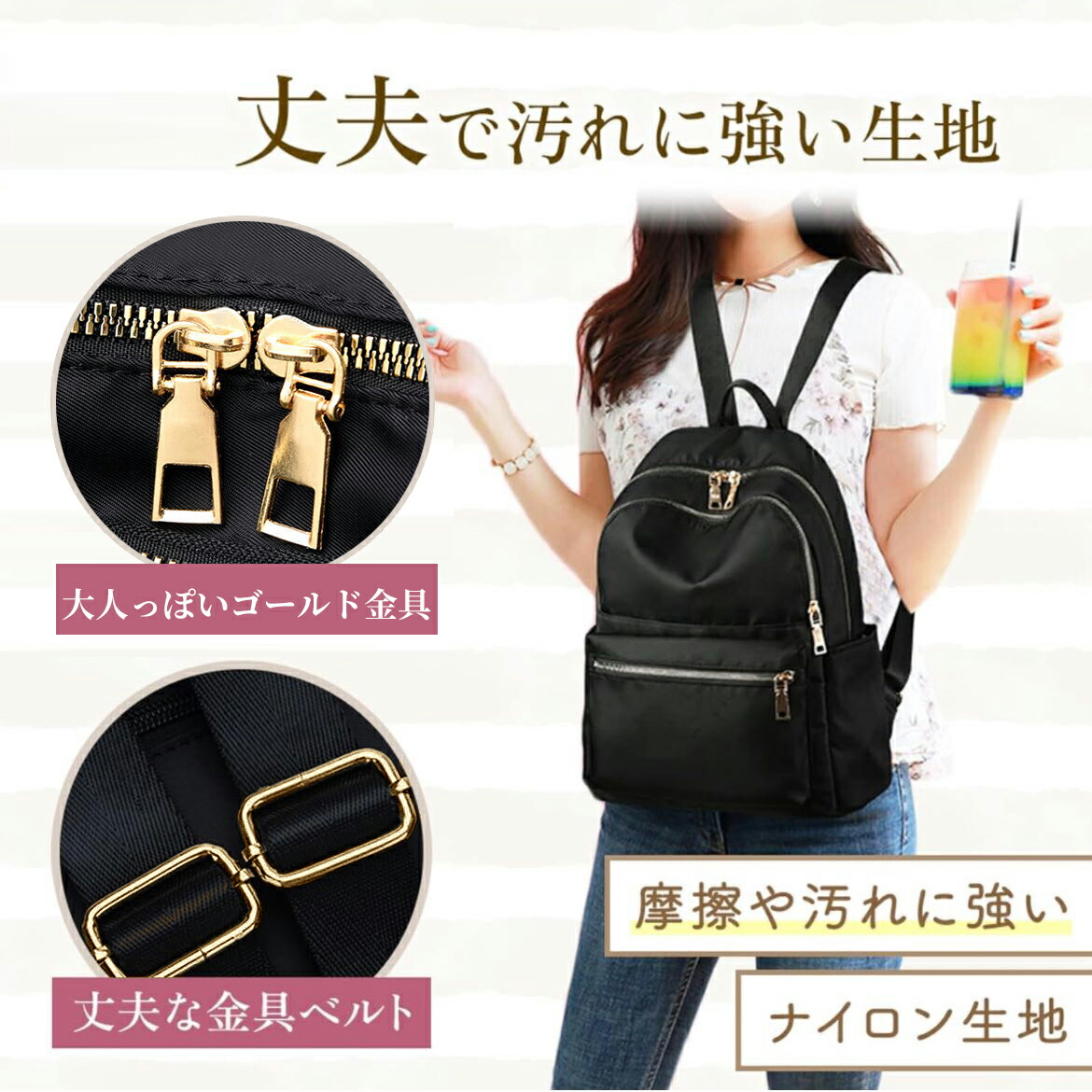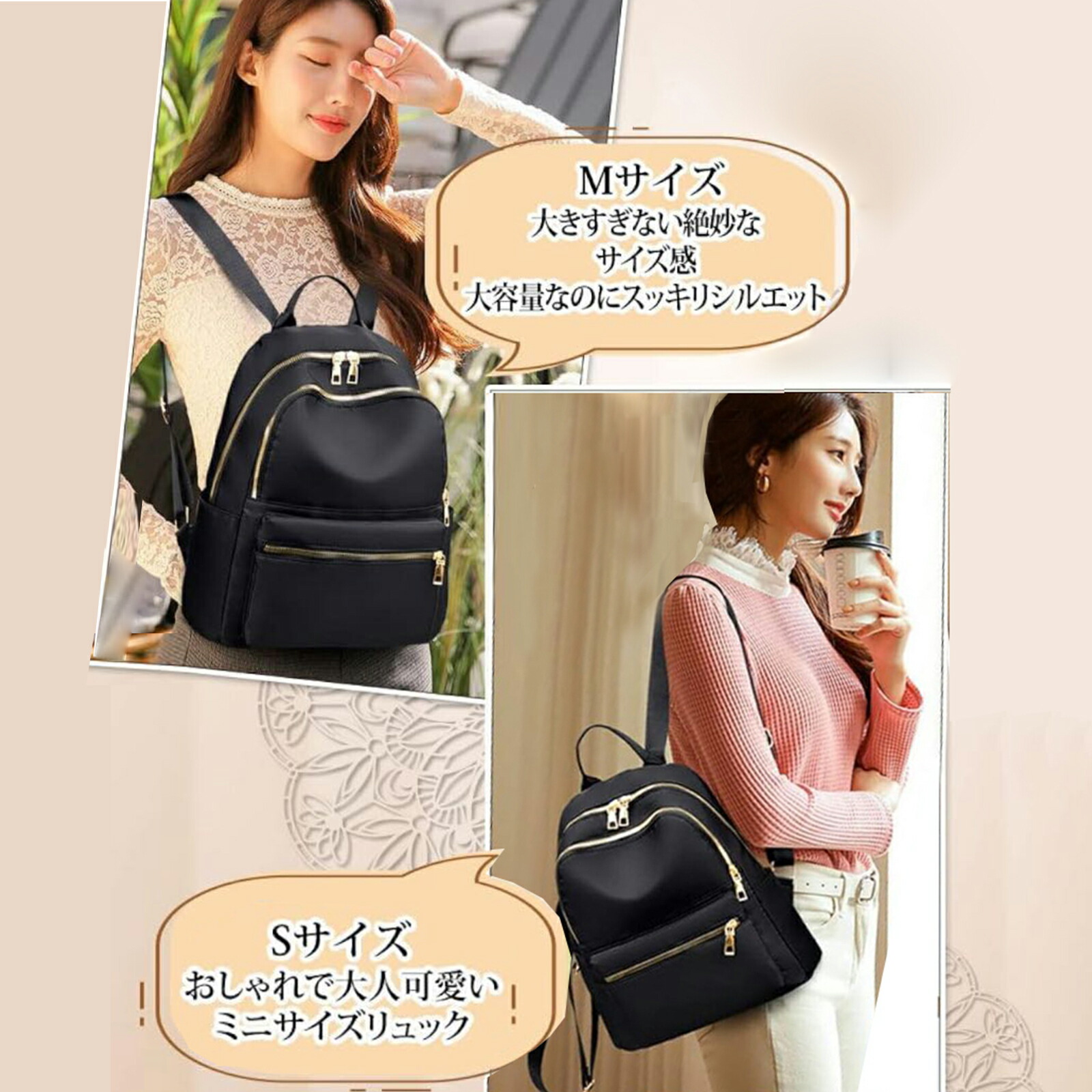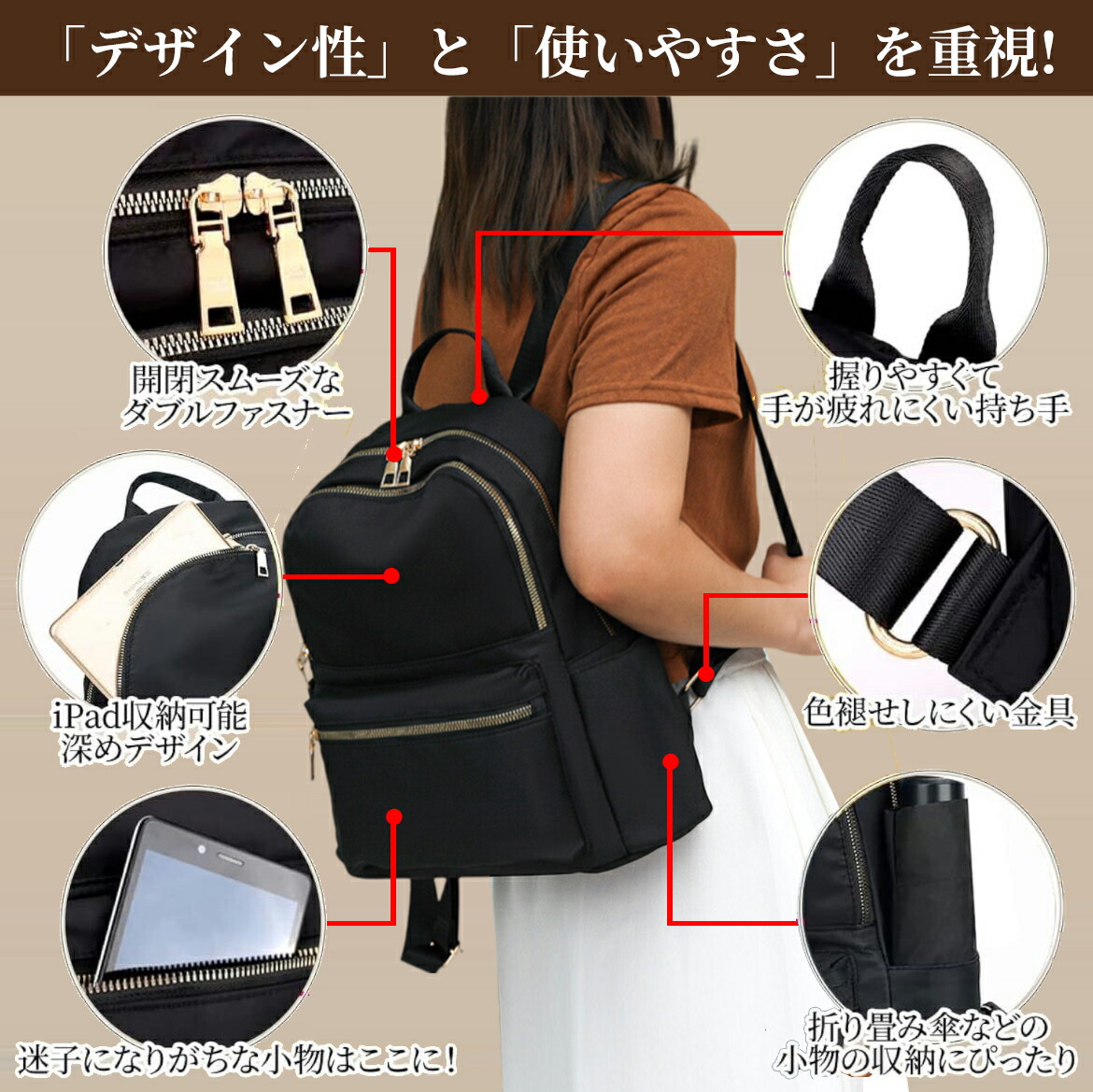 【あらゆる年代にフィットする上品なデザイン】 ゴールドで統一したディテールが上品な雰囲気の大人可愛いリュックは、20代、30代、40代、50代のあらゆる年代の女性に選ばれています。