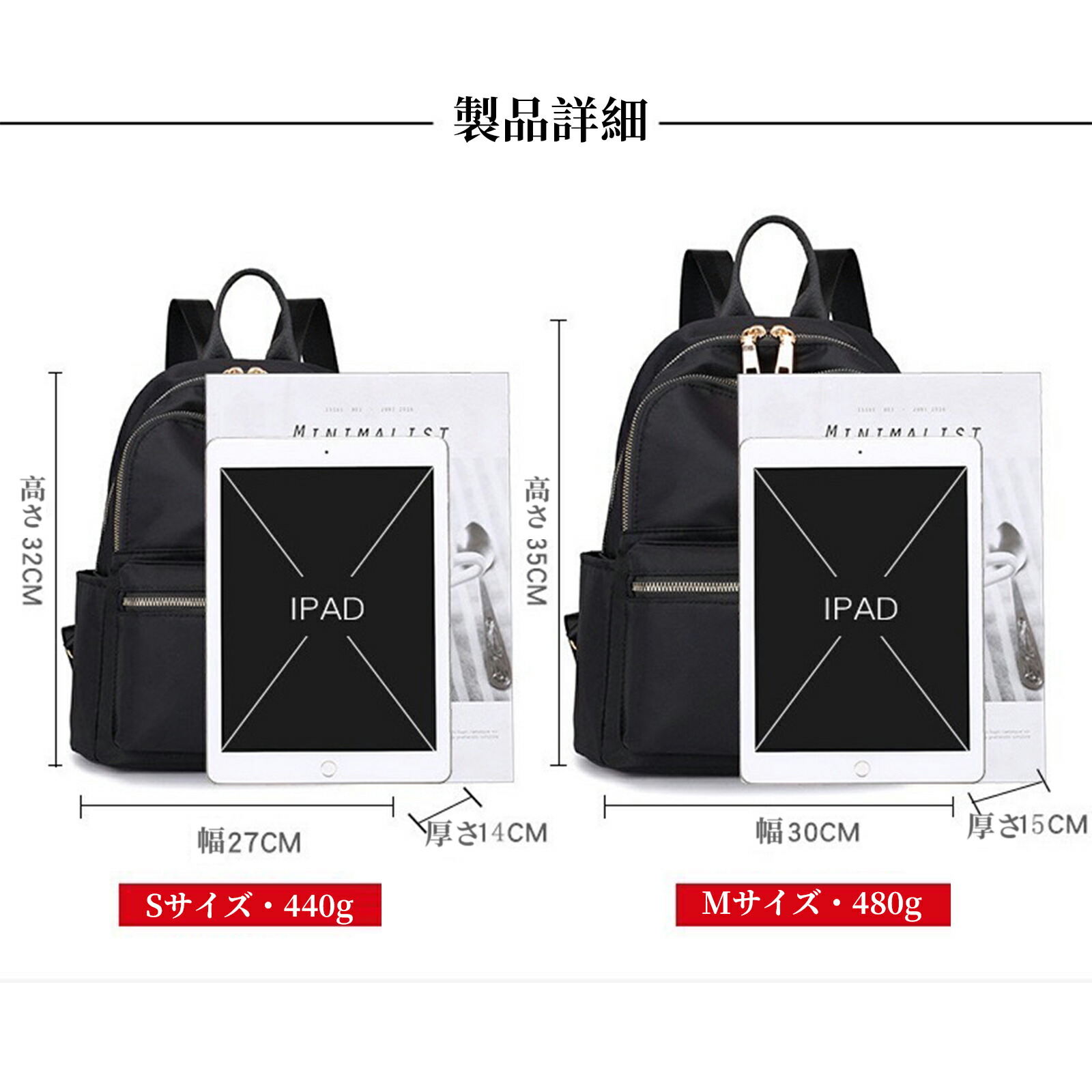 【選べる2サイズ】 ちょっとした外出にも使いやすい Sサイズ:(W)27x(H)32x(D)14cm 重さ440g、 普段使いにできA4雑誌がぴったり入る Mサイズ:(W)30x(H)35x(D)15cm 重さ480g、 15インチのPCも入る.
