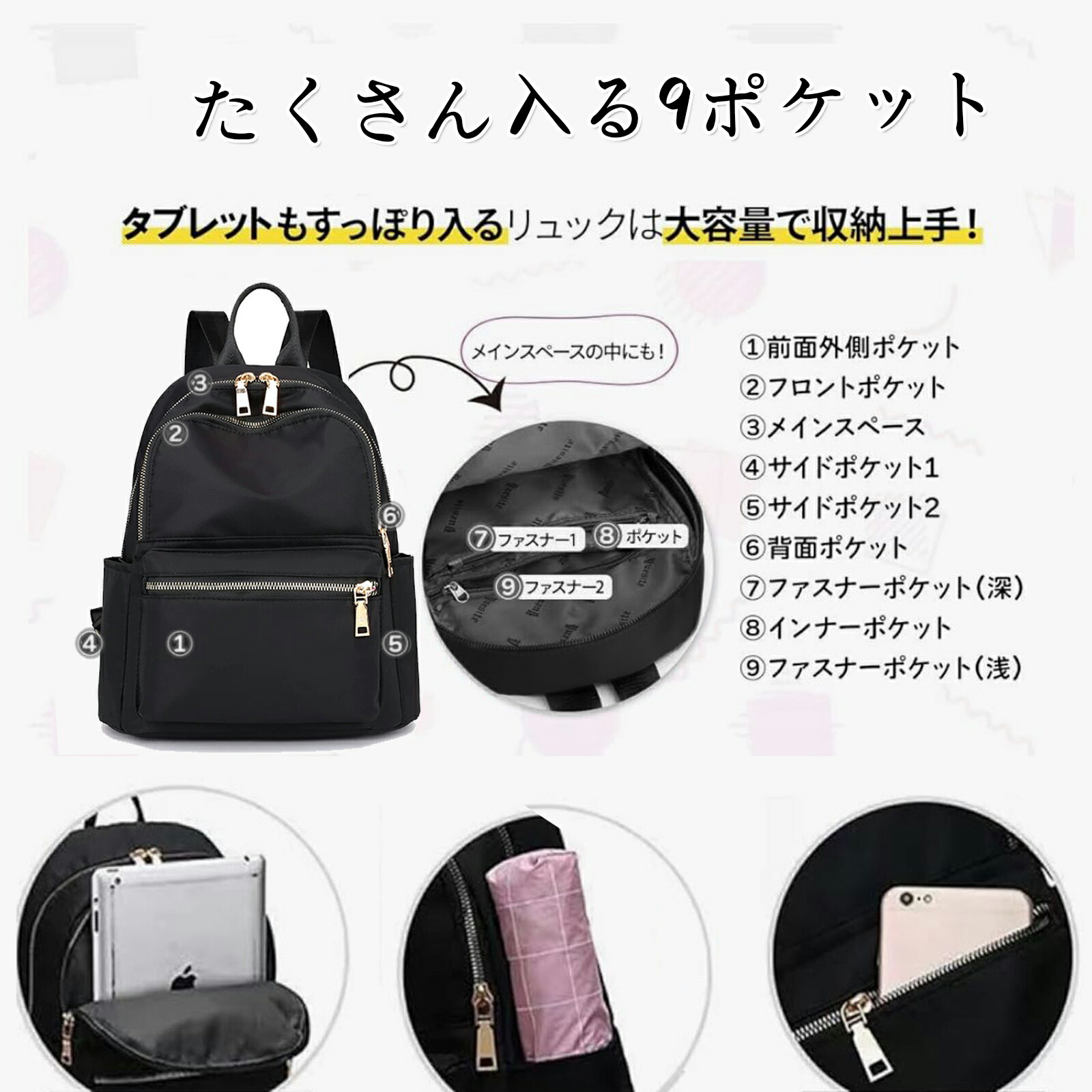 【収納状況】 A4サイズの書類を収納することができ、内部と外部のデザインには複数の小さなポケットがあり、iPad、折り畳み傘、財布、化粧品、鍵など、さまざまな小物を整理したり分類したり保管したりするのに便利です。