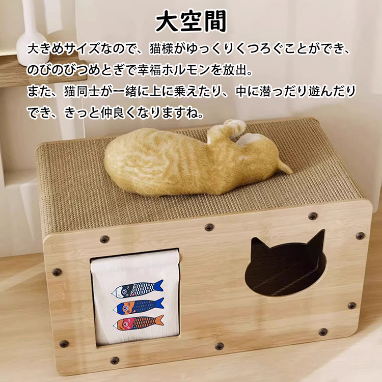 ※大きめサイズなので、猫様がゆっくりくつろぐことができ、のびのびつめとぎで幸福ホルモンを放出♪また、猫同士が一緒に上に乗えたり、中に潜っだり遊んだりでき、きっと仲良くなりますね。