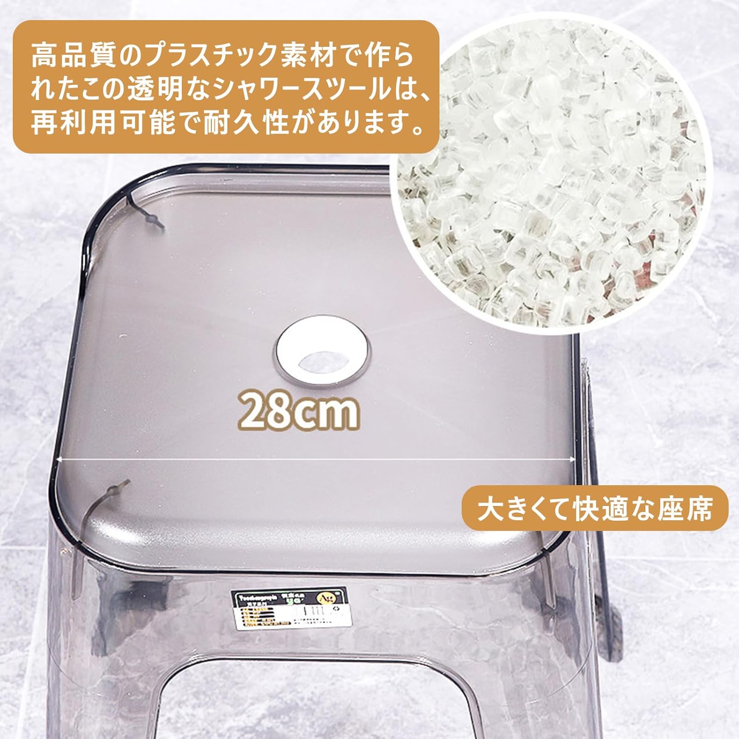 【信頼性の高い素材】高品質のプラスチック素材で作られたこの透明なシャワースツールは、再利用可能で耐久性があります。引っ張り強さや耐荷重性に優れ、体重が大きい な方でも安心して乗ったり座ったりすることができます。
