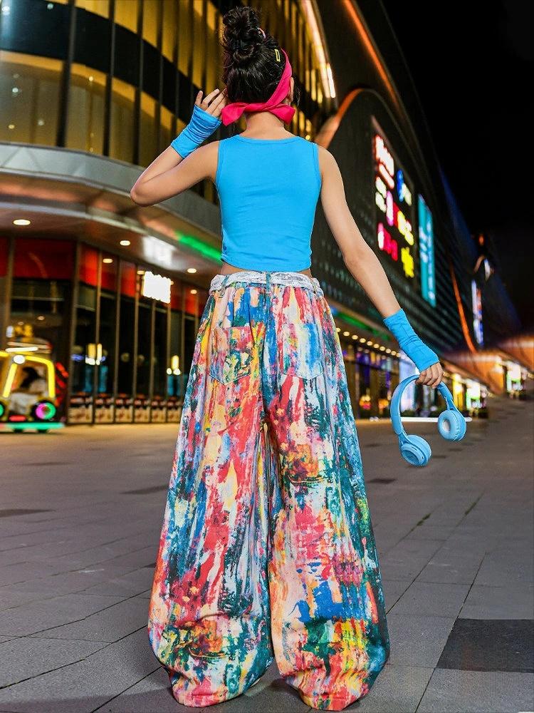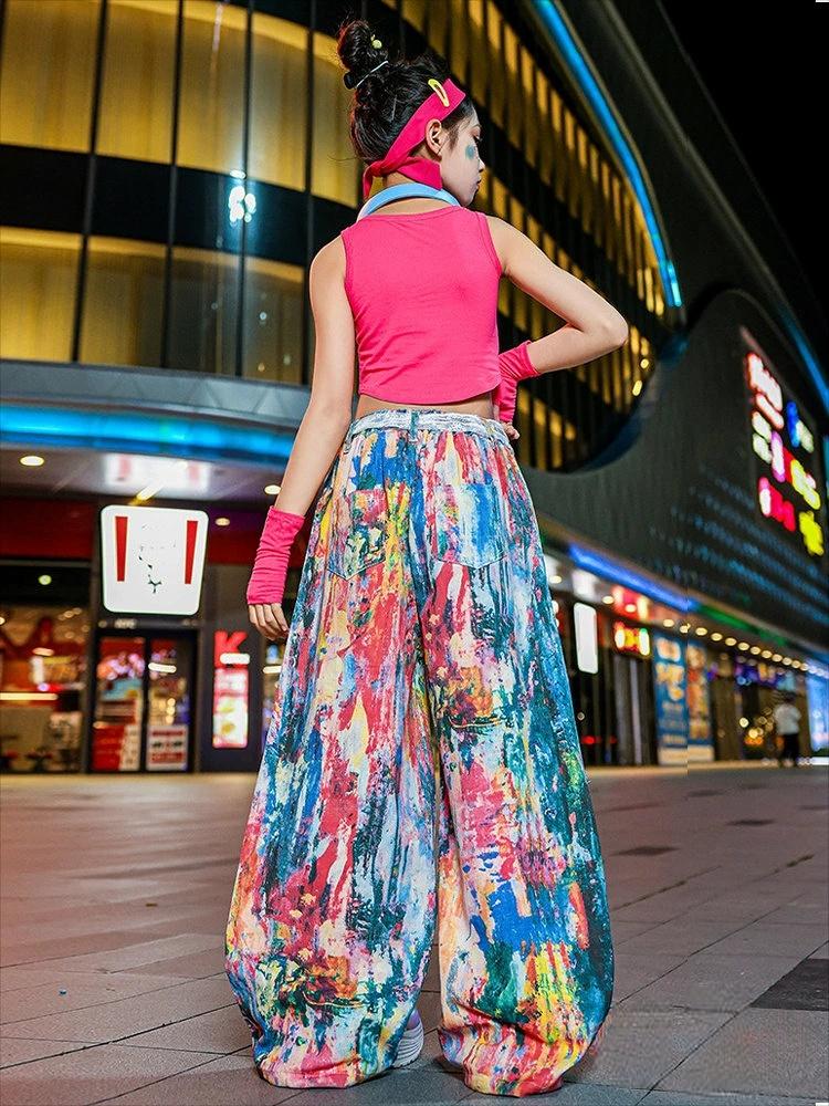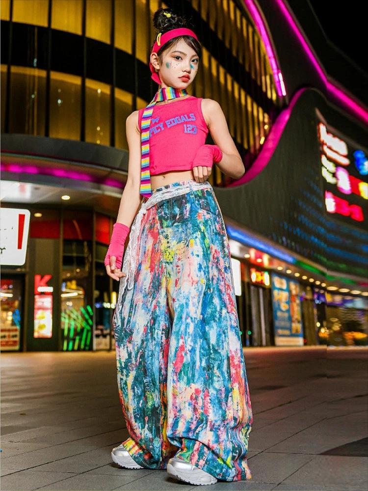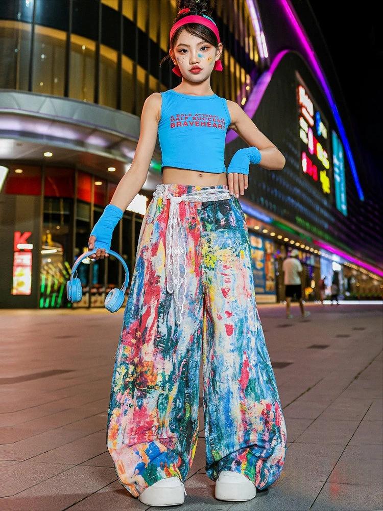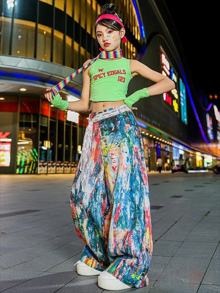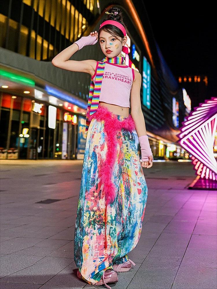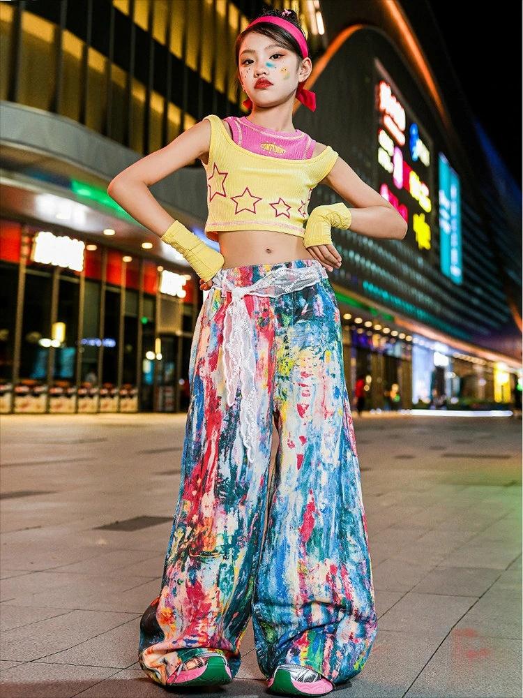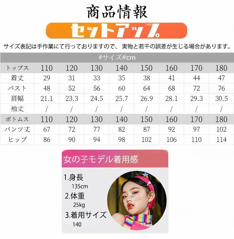 女の子 JAZZ 韓国 k-pop キッズ ダンス衣装 セットアップ 柄パンツ チア チアガール ダンスパンツ へそ出し 肩だし トップス カラフル