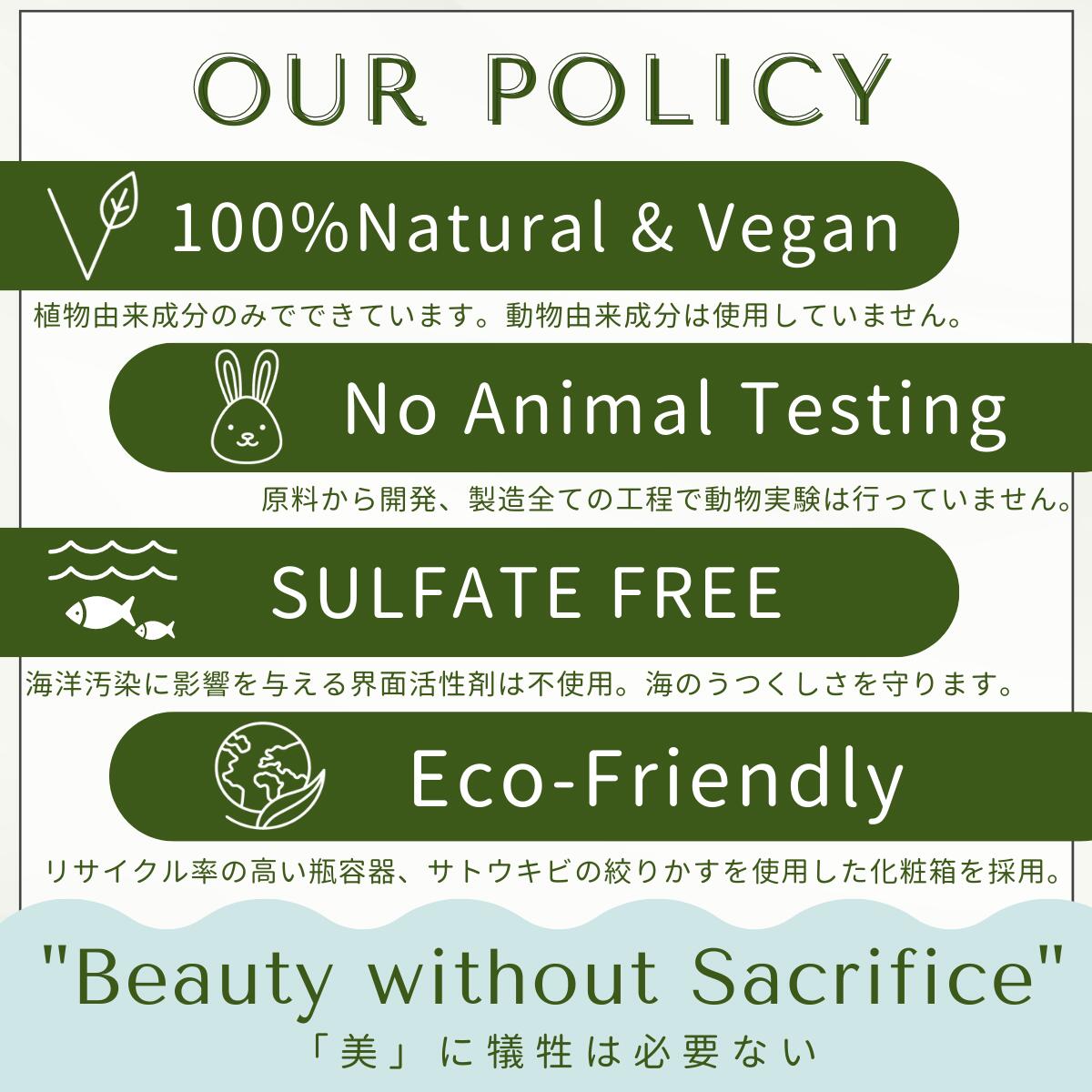 100%植物由来成分、動物性原料不使用、クルエルティフリー(動物実験を行なっていない)、リサイクル可能な瓶容器使用、サトウキビの搾りかすを使用した化粧箱を採用。中身からパッケージまで可能な限りサステナブルな商品を目指しました。