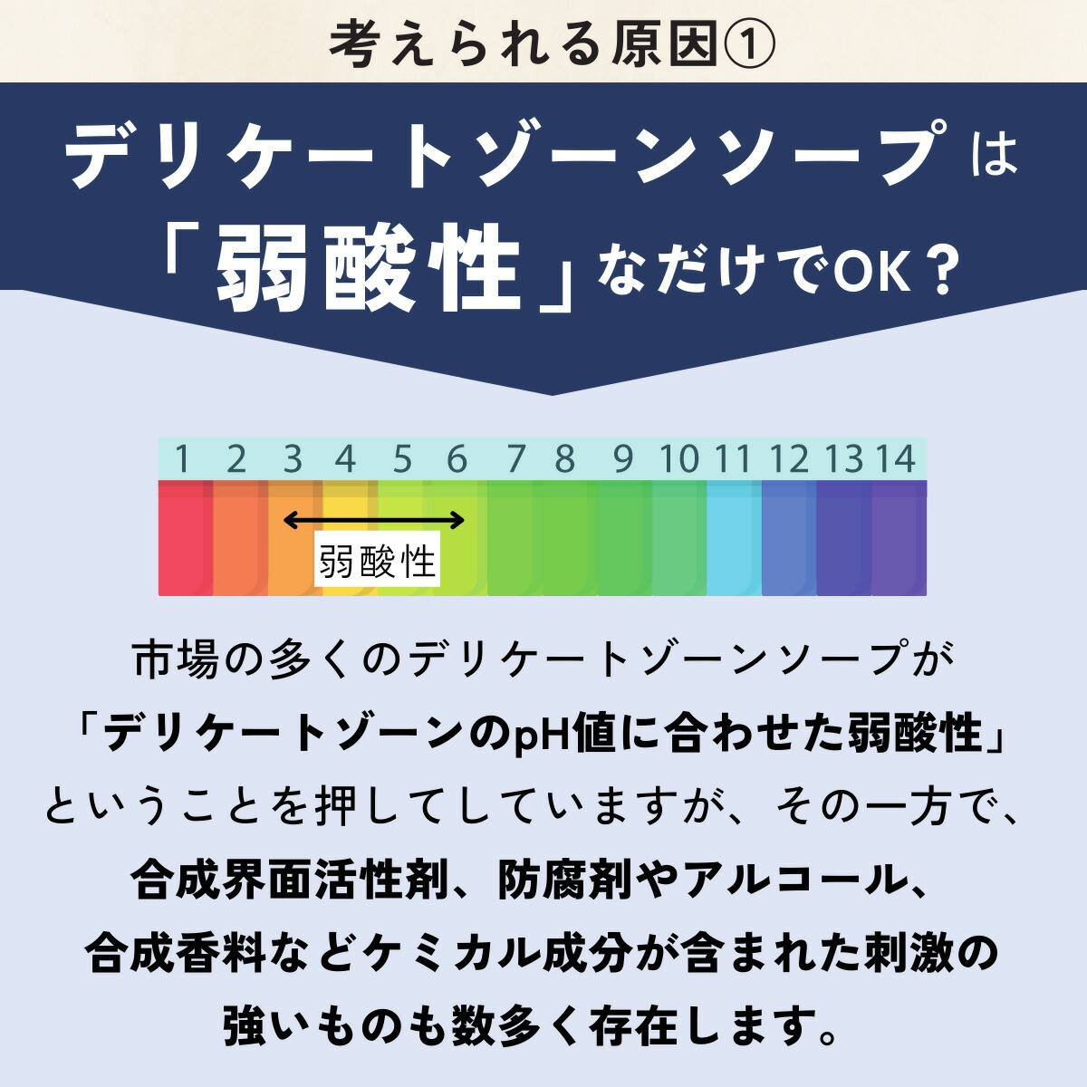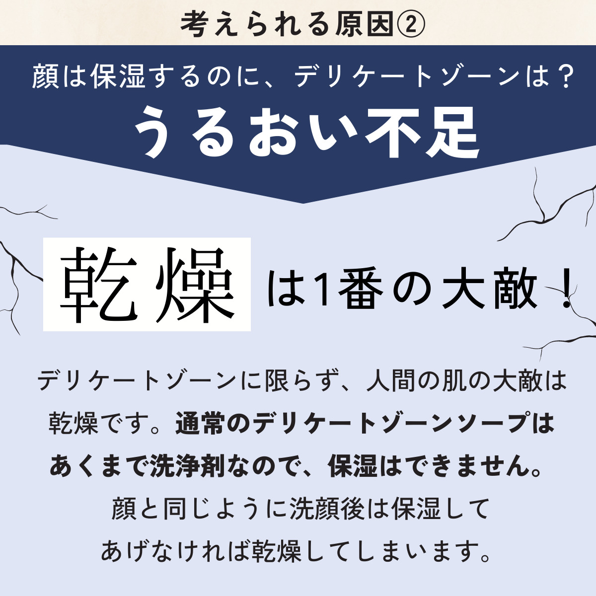 人の皮脂に近く、保湿力の高い「ホホバ種子油」や「マカデミア種子油」などを配合し、お肌に潤いを与え、乾燥や下着やトイレットペーパーの摩擦による黒ずみを起こりにくくします。