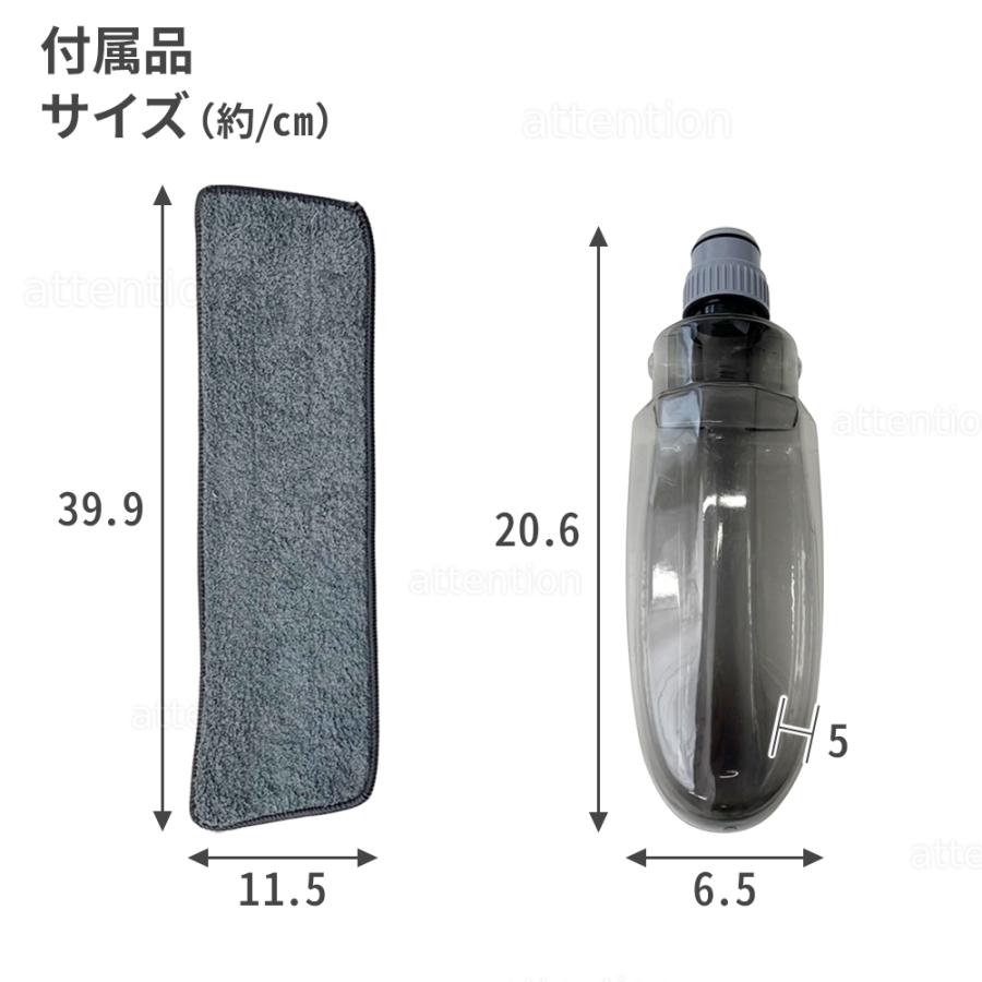 付属品:モップヘッド×1、ハンドル付きバー×1、噴射口付きバー×1、水タンク×1、取付用パッド×1、交換用パッド×1