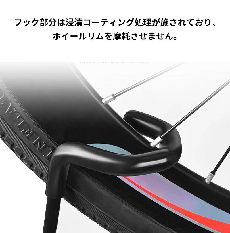 フック部の浸塑処理:車輪(ホイール)を掛けるフックは浸塑加工済みで、車輪のリムを擦ったり摩耗させたりしません。