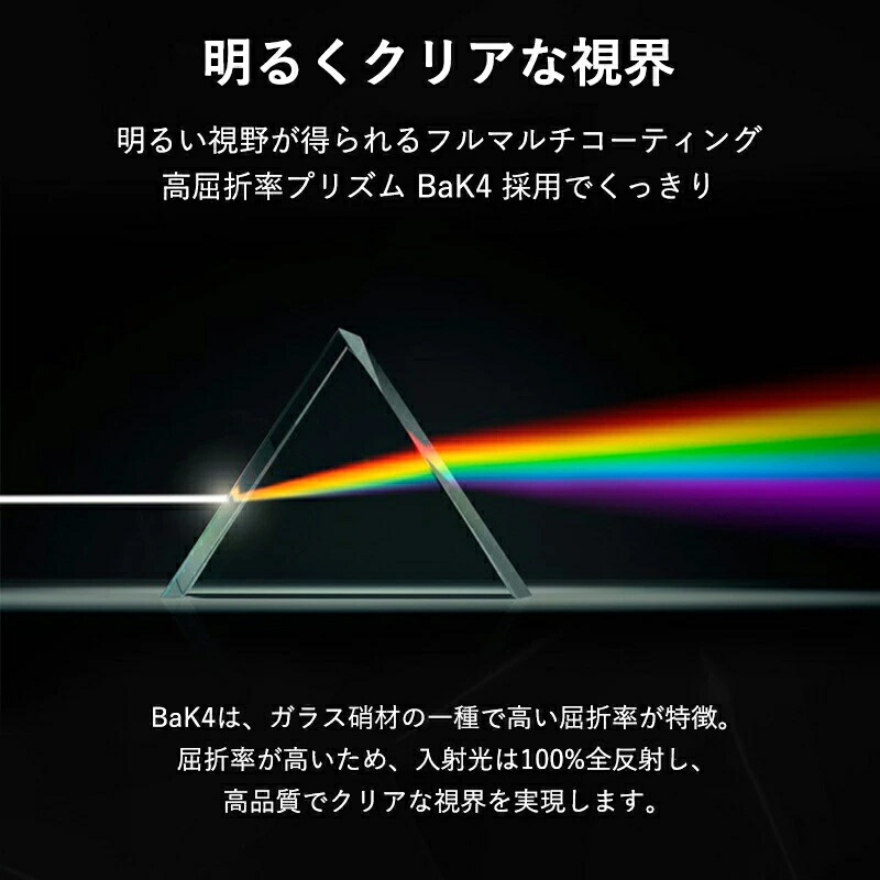 高屈折率プリズム「BaK4」を採用。入射光を 100% 全反射させ、明るく鮮明な視界を実現。