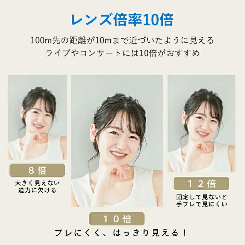ライブやコンサートでアーティストの表情までしっかり捉えられる、最適な 10 倍倍率を採用。