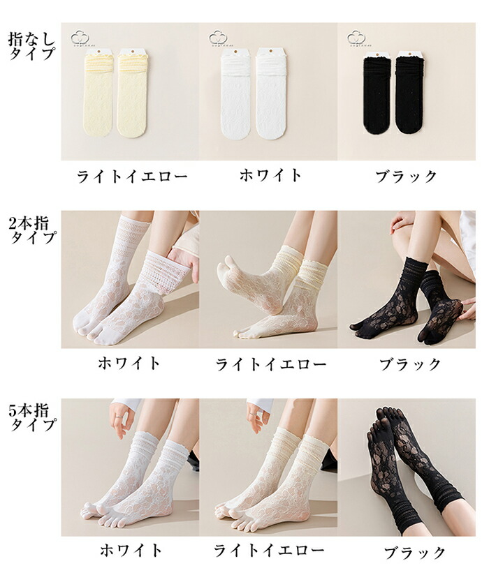 足袋ソックス レース レディース 靴下 レディースファッション 豊富 ライトイエロー・指なし ホワイト・指なし ブラック・指なし ホワイト・2本指 ライトイエロー・2本指 ブラック・2本指 ホワイト・5本指 ライトイエロー・5本指 ブラック・5本指