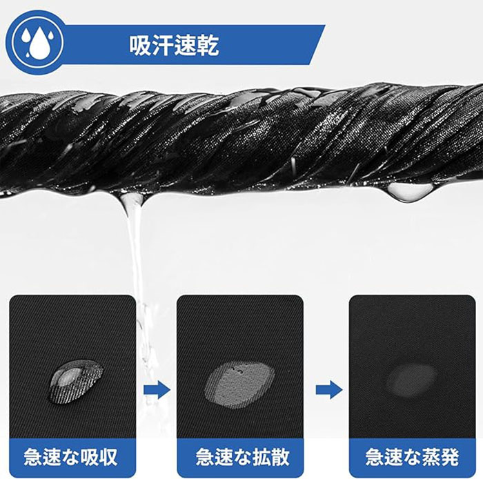 【吸汗速乾】通気と速乾性に優れた素材を使用しており、通気性が抜群と呼吸がしやすく、汗も素早く吸収・蒸発させます。汗をかいてもサラサラ感が持続し、気化熱でさらに涼しく感じられます。