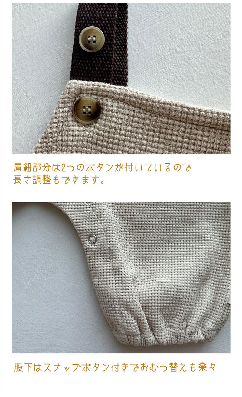 肩ひもには2つボタンが付いていてサイズ調節可能。動き回る赤ちゃんだからこそ簡単には外れないようにしっかりと留める仕様。身体に合わせて調節しやすいから成長の早い赤ちゃんとの相性バッチリ!!