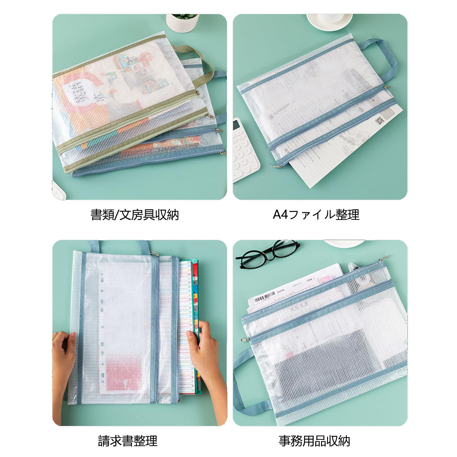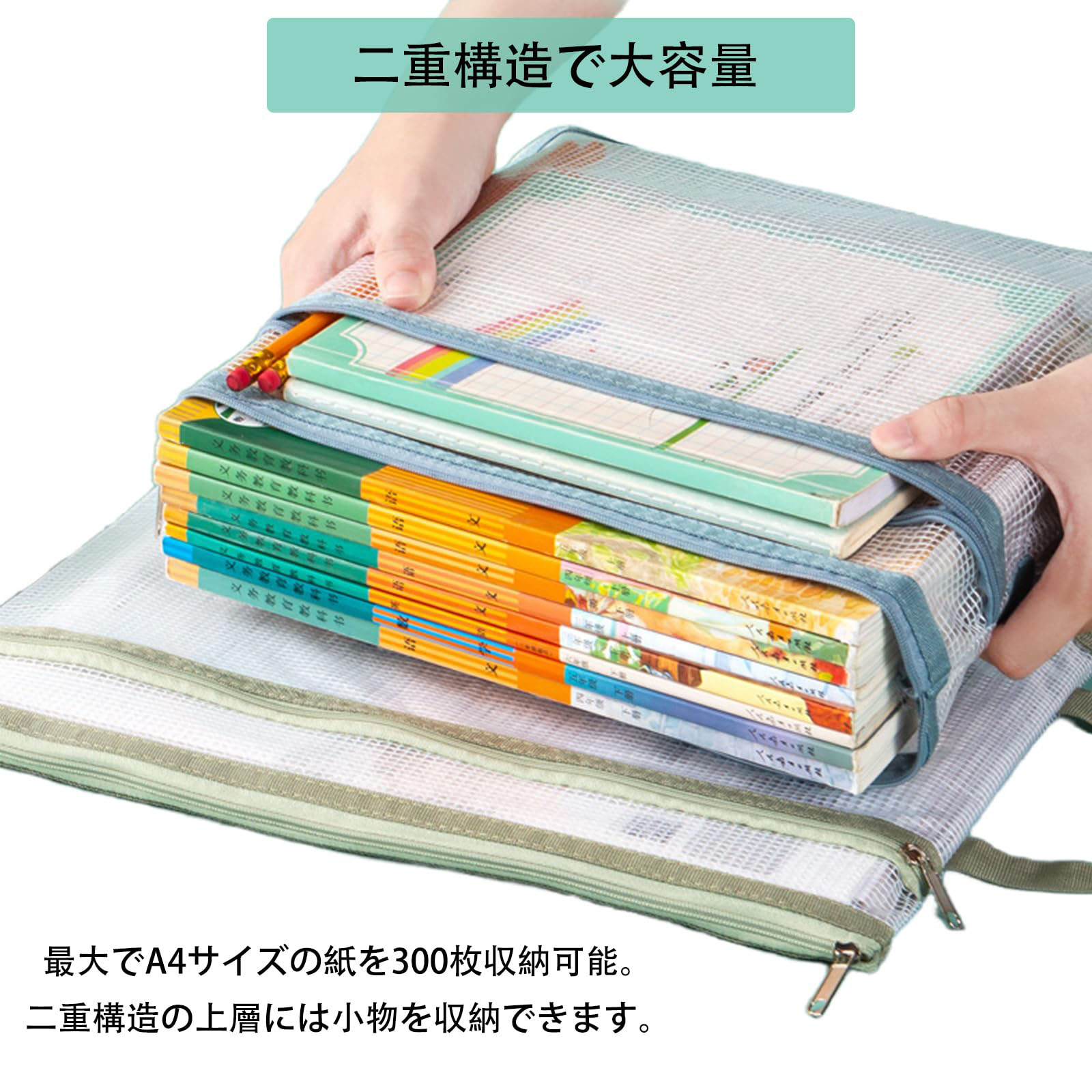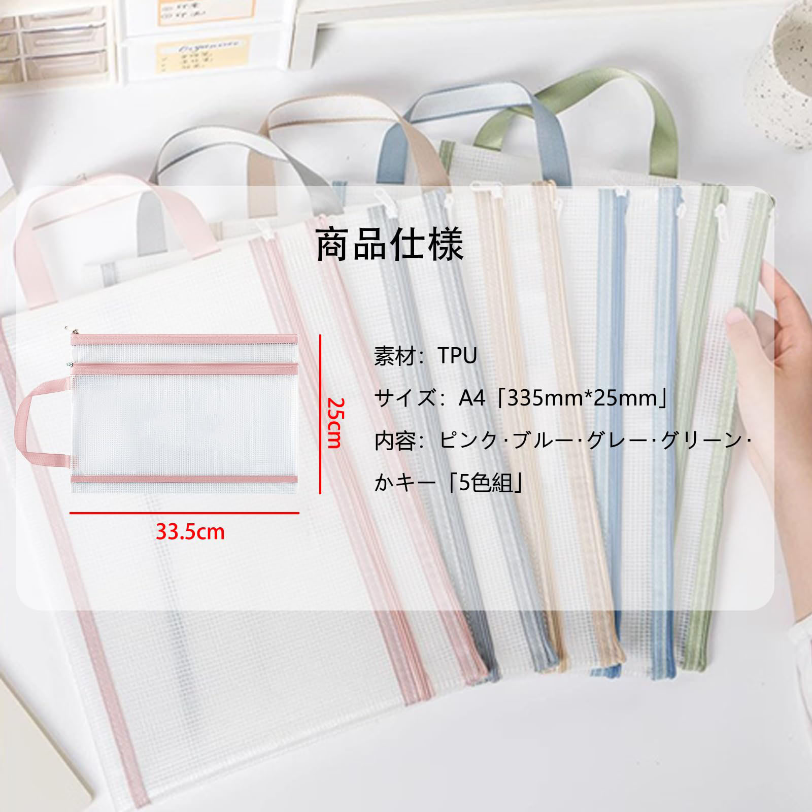 【商品仕様】サイズ:A4(33.5*25cm)内容:5枚組(ピンクプルーグレーグリーン かキー) 素材:TPU 【二重収納で仕分けに便利】二重収納構造で、上層には文房具などの小物を収納でき、下層には最大300枚のA4用紙を収納できます。書類や文房具を簡単に整然と収納でき、重要な書類の紛失を効果的に防ぎます。 【高品質素材】高品質の防水TPU素材を使用しており、頑丈で耐久性があり、破損しにくいです。透明な素材は中身をはっきりと見ることができます。金属ファスナーで取り出しやすい 【持ち運びやすい】持ち手は頑丈で耐久性のある素材を使用しており、使用中に断裂しにくいことが確保されています。また、幅広の持ち手を設計しているため、持ち上げる際に手に不快感を感じることがなく、長時間の持ち運びが容易です。これにより、使用の便利さと快適さが大幅に向上しています。 【多用途】多種多様なアイテムを収納できます。特に学校、病院、オフィス、旅行などに適しており、書類、領収書、鉛筆、ペン、衣類、化粧品、装飾品などを整理するのに便利です。旅行や日常生活のさまざまな収納ニーズに応えます。