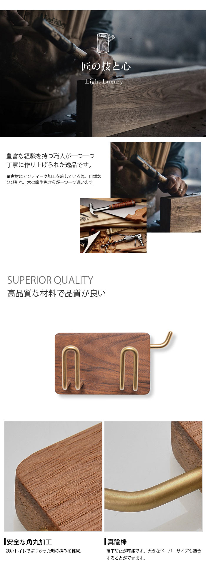 ♪高品質な黒クルミ材を採用し、高品質な真鍮素材を使用していますので錆びや色あせはありません。